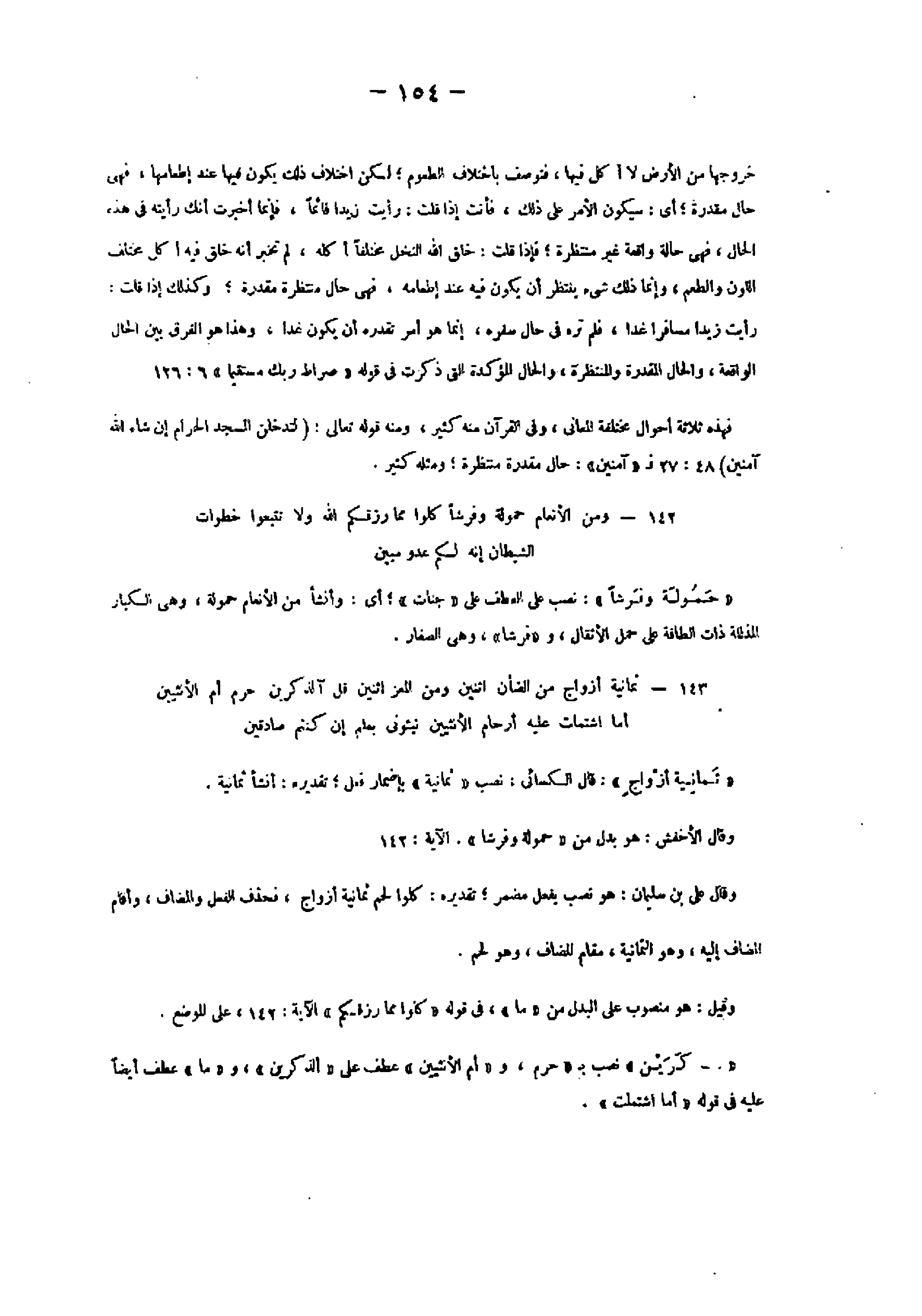 وقال الأخفش: هو بدل من «حمولة وفرشا» . الآية: 142 وقال على بن سليمان: هو نصب بفعل مضمر تقديره: كلوا لحم ثمانية أزواج، فحذف الفعل والمضاف، وأقام المضاف إليه، وهو الثمانية، مقام المضاف، وهو لحم.