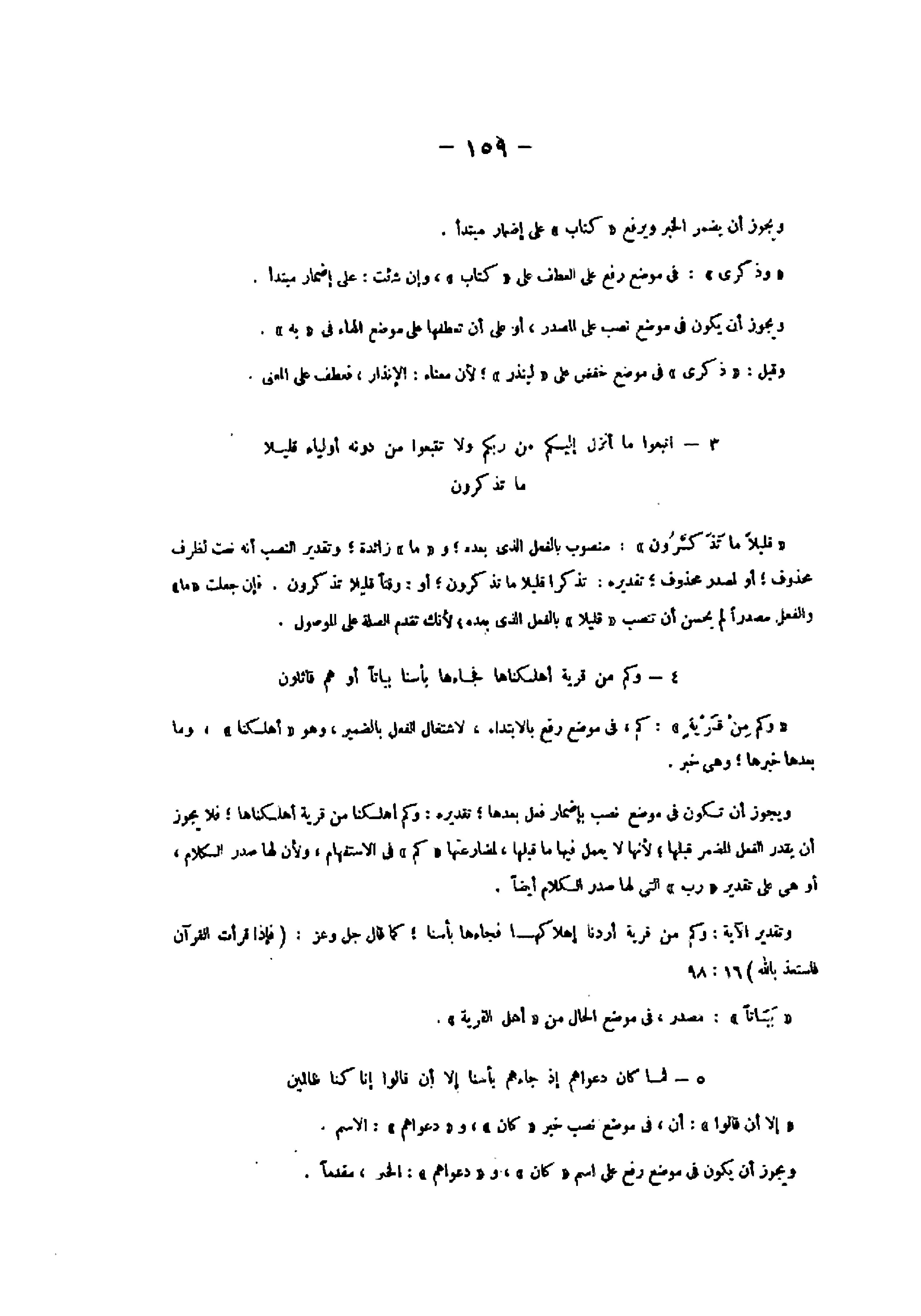 3- اتَّبِعُوا ما أُنْزِلَ إِلَيْكُمْ مِنْ رَبِّكُمْ وَلا تَتَّبِعُوا مِنْ دُونِهِ أَوْلِياءَ قَلِيلًا ما تَذَكَّرُونَ «قليلا ما تذكّرون» : منصوب بالفعل الذي بعده و «ما» زائدة وتقدير النصب أنه نعت لظرف محذوف أو لمصدر محذوف تقديره: تذكرا قليلا ما تذكرون أو: وقتا قليلا تذكرون. فإن جعلت «ما» والفعل مصدرا لم يحسن أن تنصب «قليلا» بالفعل الذي بعده لأنك تقدم الصلة على الموصول.