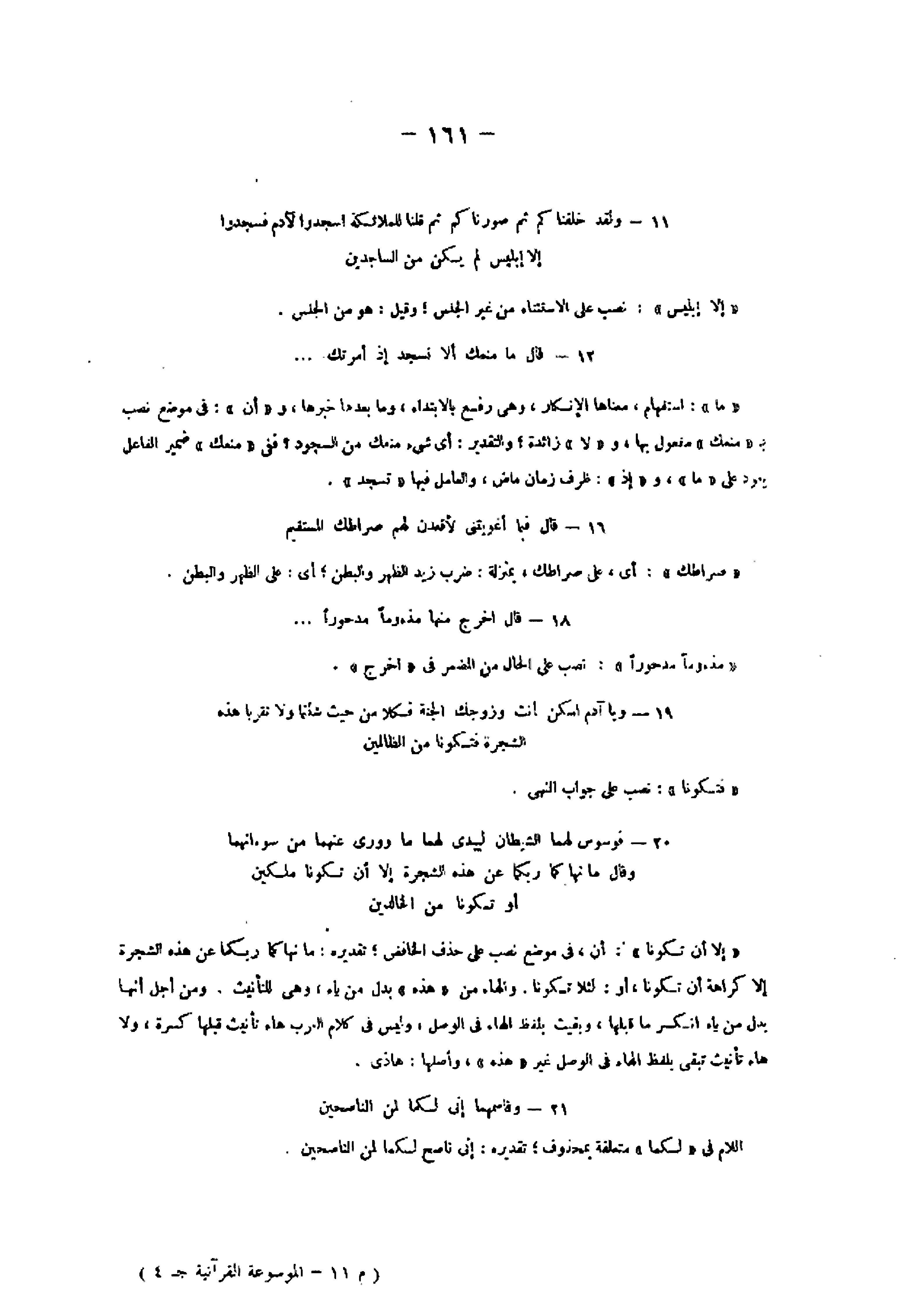 11- وَلَقَدْ خَلَقْناكُمْ ثُمَّ صَوَّرْناكُمْ ثُمَّ قُلْنا لِلْمَلائِكَةِ اسْجُدُوا لِآدَمَ فَسَجَدُوا إِلَّا إِبْلِيسَ لَمْ يَكُنْ مِنَ السَّاجِدِينَ «إلا إبليس» : نصب على الاستثناء من غير الجنس وقيل: هو من الجنس.