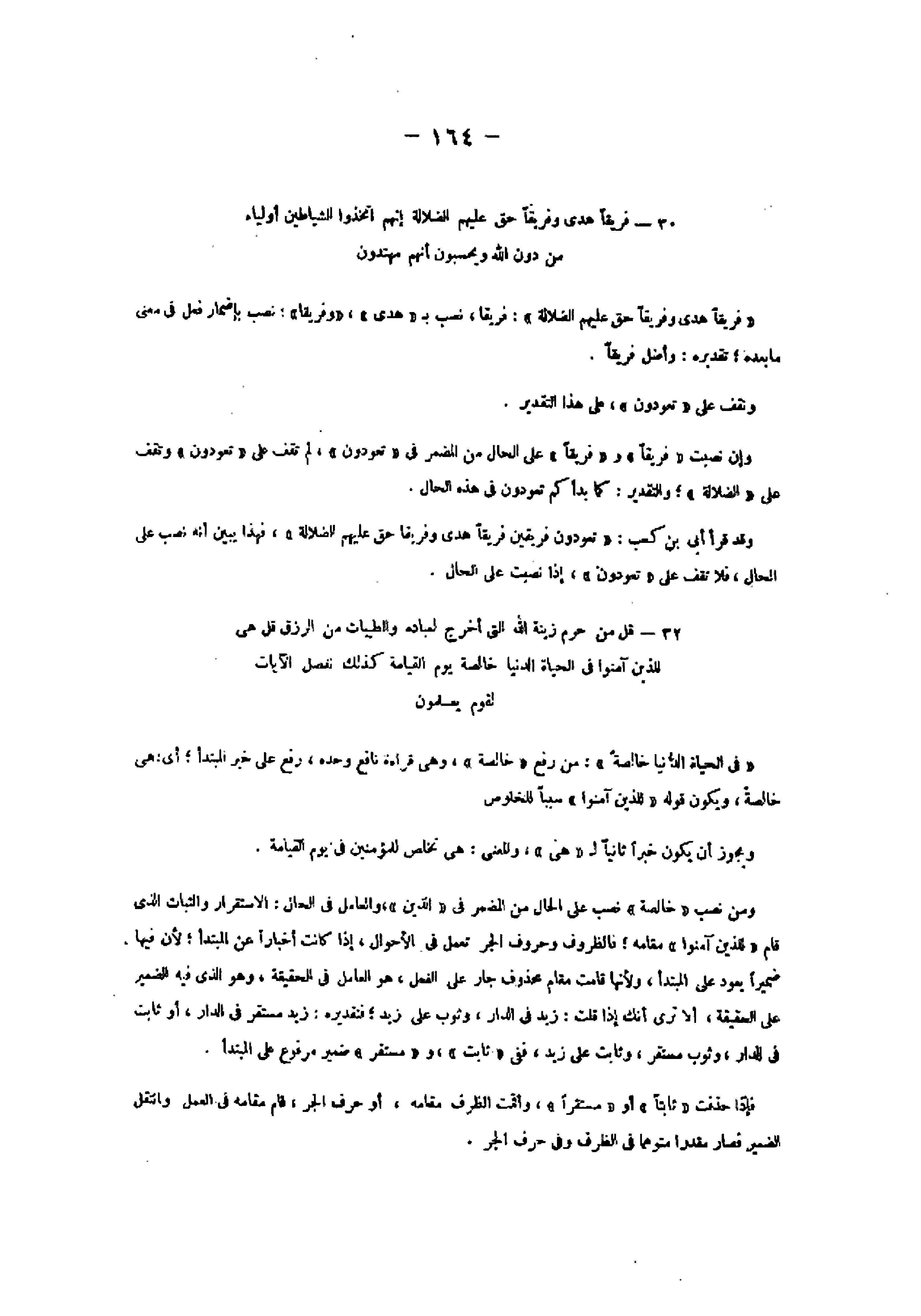 30- فَرِيقاً هَدى وَفَرِيقاً حَقَّ عَلَيْهِمُ الضَّلالَةُ إِنَّهُمُ اتَّخَذُوا الشَّياطِينَ أَوْلِياءَ مِنْ دُونِ اللَّهِ وَيَحْسَبُونَ أَنَّهُمْ مُهْتَدُونَ «فريقا هدى وفريقا حق عليهم الضلالة» : فريقا، نصب ب «هدى» ، «وفريقا» : نصب بإضمار فعل فى معنى ما بعده تقديره: وأضل فريقا.