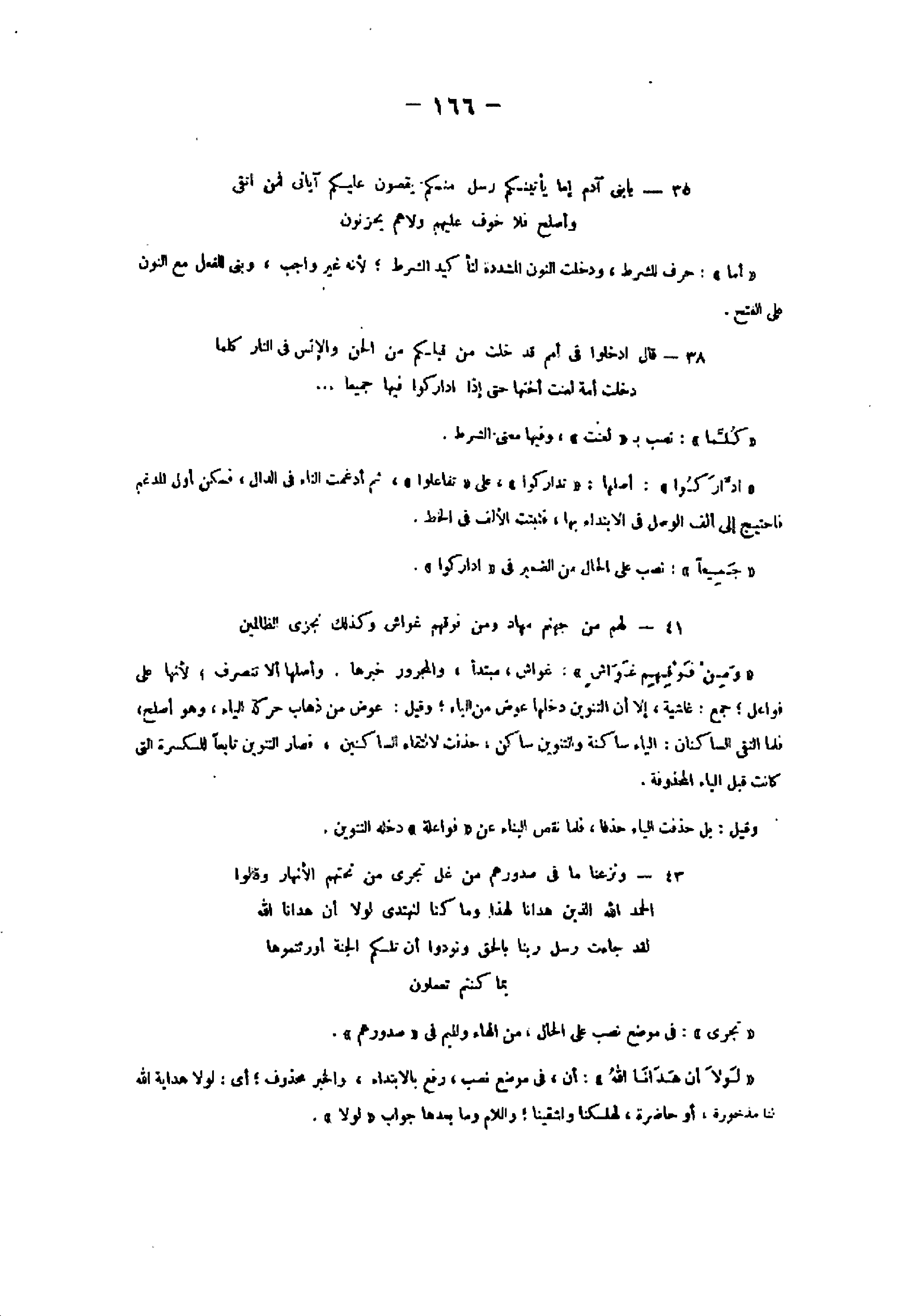 35- يا بَنِي آدَمَ إِمَّا يَأْتِيَنَّكُمْ رُسُلٌ مِنْكُمْ يَقُصُّونَ عَلَيْكُمْ آياتِي فَمَنِ اتَّقى وَأَصْلَحَ فَلا خَوْفٌ عَلَيْهِمْ وَلا هُمْ يَحْزَنُونَ «أما» : حرف للشرط، ودخلت النون المشددة لتأكيد الشرط لأنه غير واجب، وبنى للفعل مع النون على الفتح.