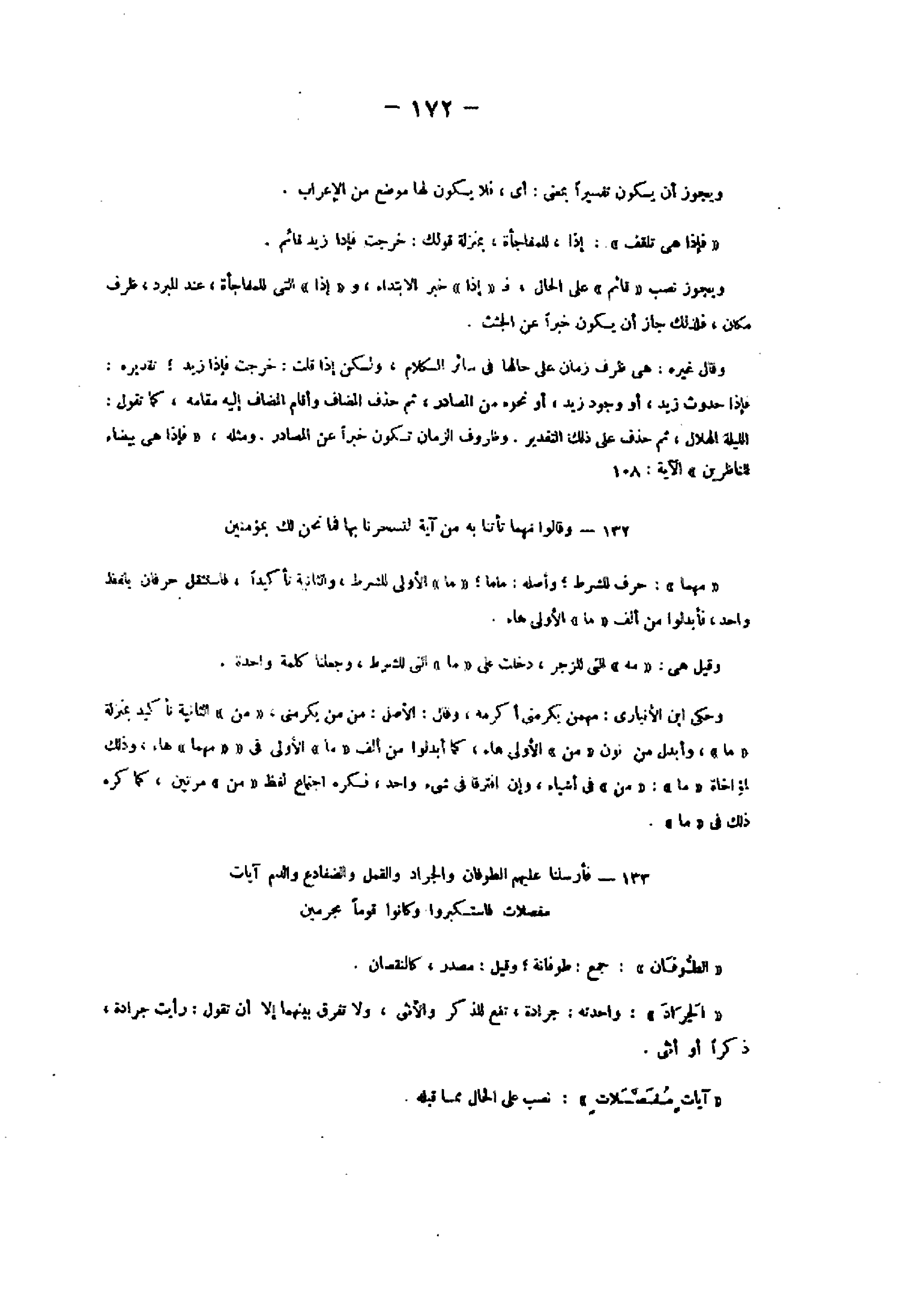 133- فَأَرْسَلْنا عَلَيْهِمُ الطُّوفانَ وَالْجَرادَ وَالْقُمَّلَ وَالضَّفادِعَ وَالدَّمَ آياتٍ مُفَصَّلاتٍ فَاسْتَكْبَرُوا وَكانُوا قَوْماً مُجْرِمِينَ «الطّوفان» : جمع: طوفانة وقيل: مصدر، كالنقصان.