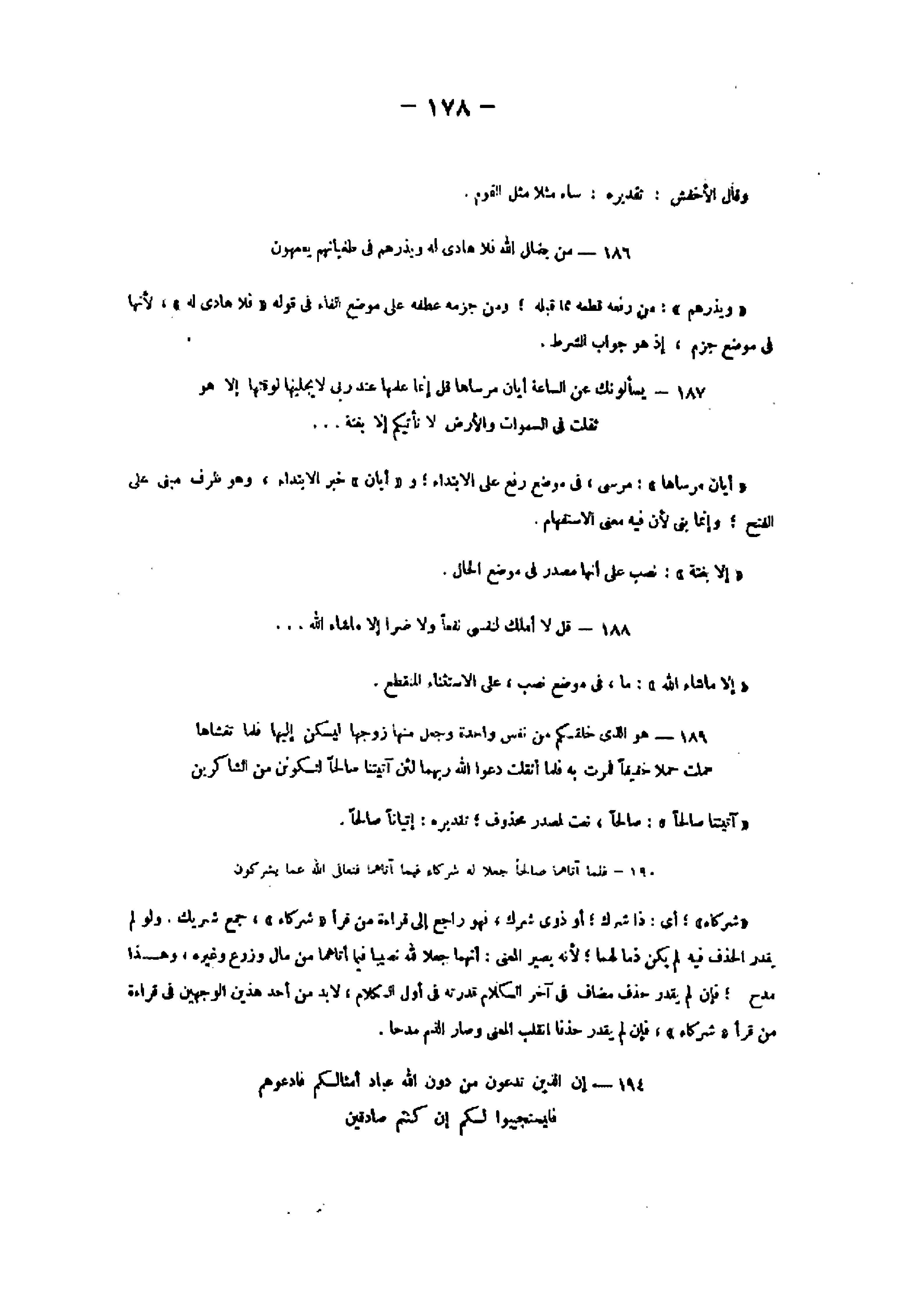 190- فَلَمَّا آتاهُما صالِحاً جَعَلا لَهُ شُرَكاءَ فِيما آتاهُما فَتَعالَى اللَّهُ عَمَّا يُشْرِكُونَ «شركاء» أي: ذا شرك أو ذوى شرك، فهو راجع إلى قراءة من قرأ «شركاء» ، جمع شريك، ولو لم يقدر الحذف فيه لم يكن ذما لهما لأنه يصير المعنى: أنهما جعلا لله نصيبا فيما أتاهما من مال وزرع وغيره، وهذا مدح فإن لم يقدر حذف مضاف فى آخر الكلام قدرته فى أول الكلام، لا بد من أحد هذين الوجهين فى قراءة من قرأ «شركاء» ، فإن لم يقدر حذفا انقلب المعنى وصار الذم مدحا.