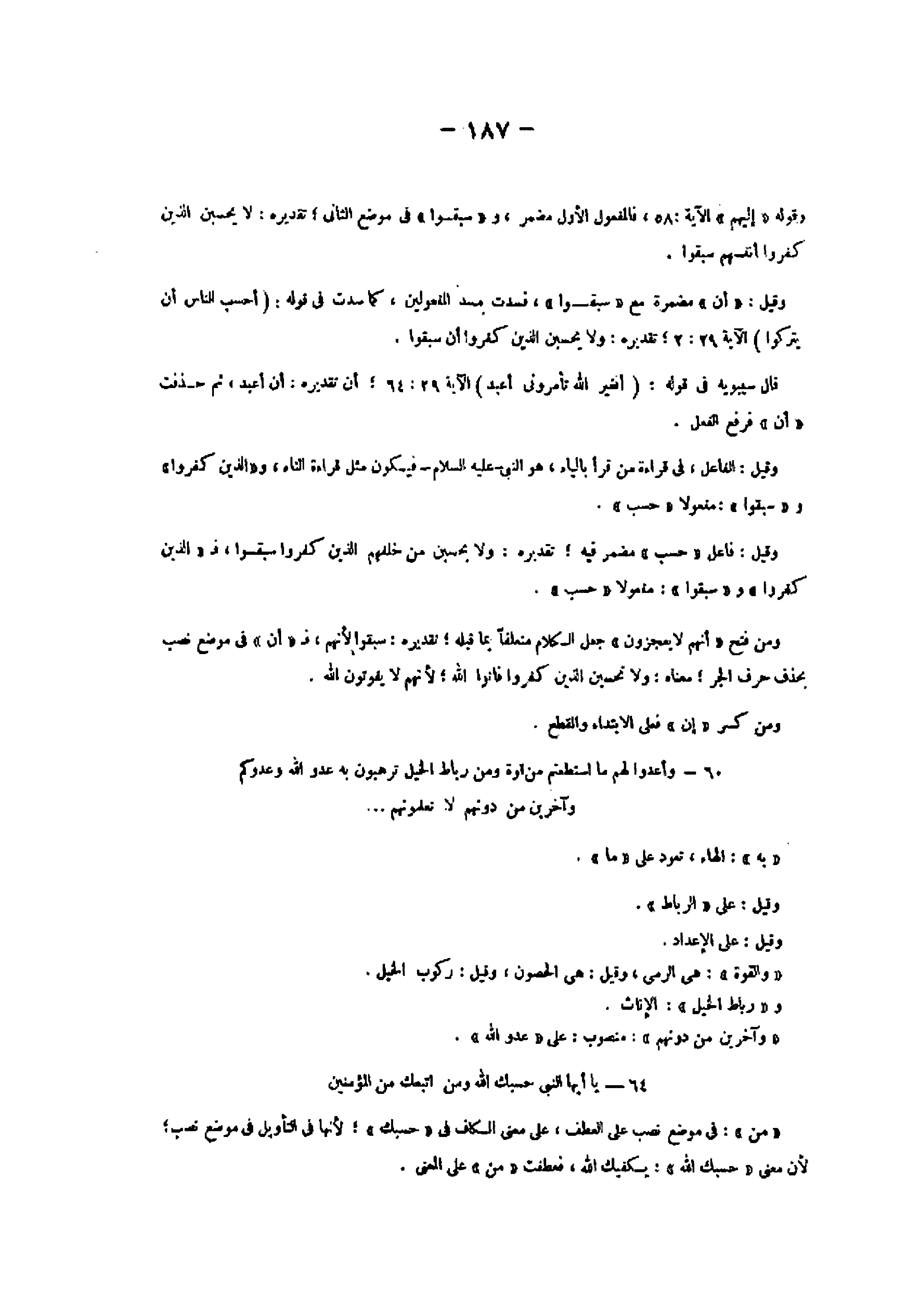 وقوله «إليهم» الآية: 58، فالمفعول الأول مضمر، و «سبقوا» فى موضع الثاني تقديره: لا يحسبن الذين كفروا أنفسهم سبقوا.