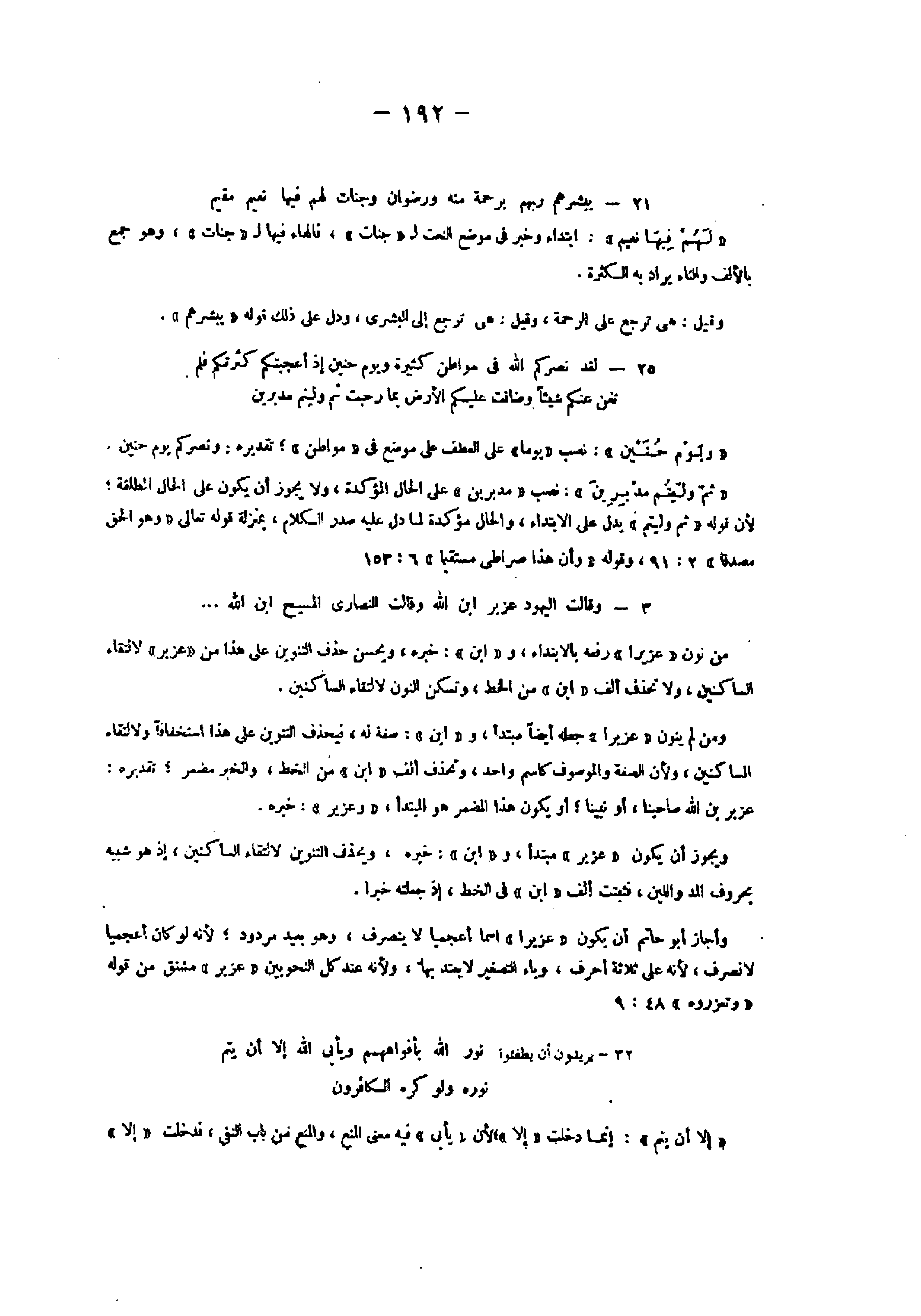 وأجاز أبو حاتم أن يكون «عزيرا» اسما أعجميا لا ينصرف، وهو بعيد مردود لأنه لو كان أعجميا لانصرف، لأنه على ثلاثة أحرف، وياء التصغير لا يعتد بها، ولأنه عند كل النحويين «عزير» مشتق من قوله «وَتُعَزِّرُوهُ» 48: 9 32- يُرِيدُونَ أَنْ يُطْفِؤُا نُورَ اللَّهِ بِأَفْواهِهِمْ وَيَأْبَى اللَّهُ إِلَّا أَنْ يُتِمَّ نُورَهُ وَلَوْ كَرِهَ الْكافِرُونَ «إلا أن يتم» : إنما دخلت «إلا» لأن «يأبى» فيه معنى المنع، والمنع من باب النفي، فدخلت «إلا»