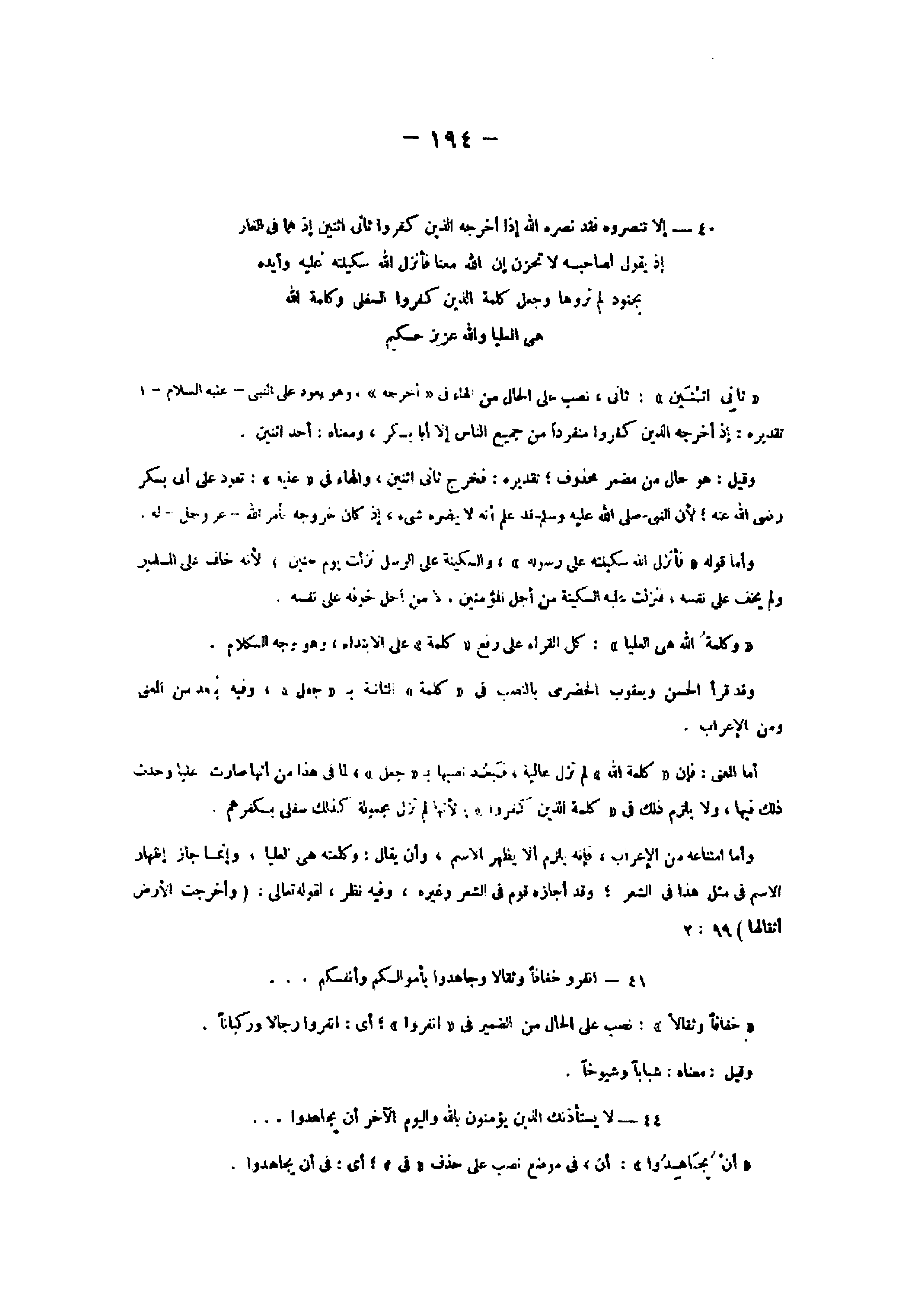 وأما امتناعه من الإعراب، فإنه يلزم ألا يظهر الاسم، وأن يقال: وكلمته هى العليا، وإنما جاز إظهار الاسم فى مثل هذا فى الشعر وقد أجازه قوم فى الشعر وغيره، وفيه نظر، لقوله تعالى: (وَأَخْرَجَتِ الْأَرْضُ أَثْقالَها) 99: 2 41- انْفِرُوا خِفافاً وَثِقالًا وَجاهِدُوا بِأَمْوالِكُمْ وَأَنْفُسِكُمْ ...