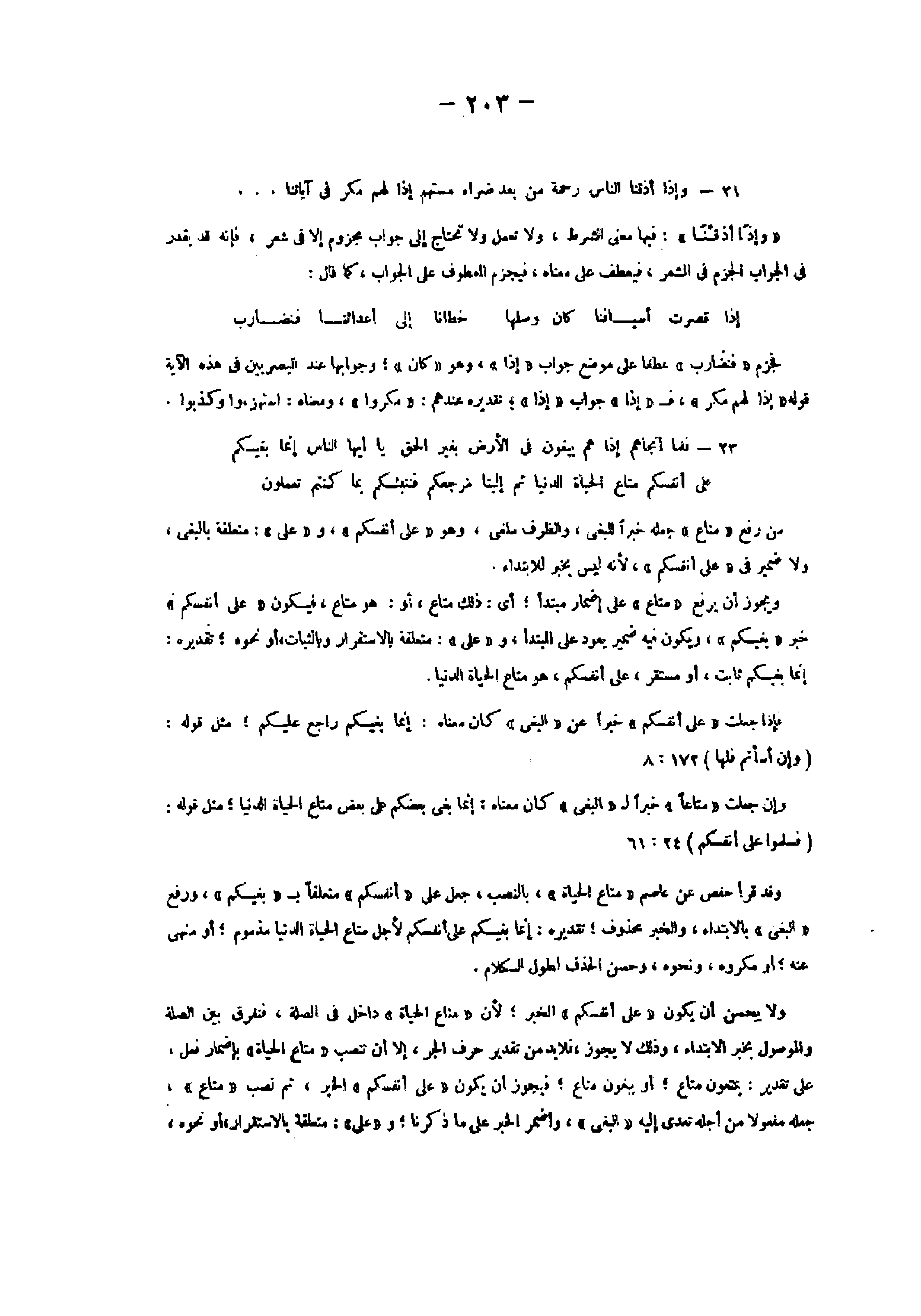 (وَإِنْ أَسَأْتُمْ فَلَها) 172: 8 وإن جعلت «متاعا» خبرا ل «البغي» كان معناه: إنما بغى بعضكم على بعض متاع الحياة الدنيا مثل قوله: