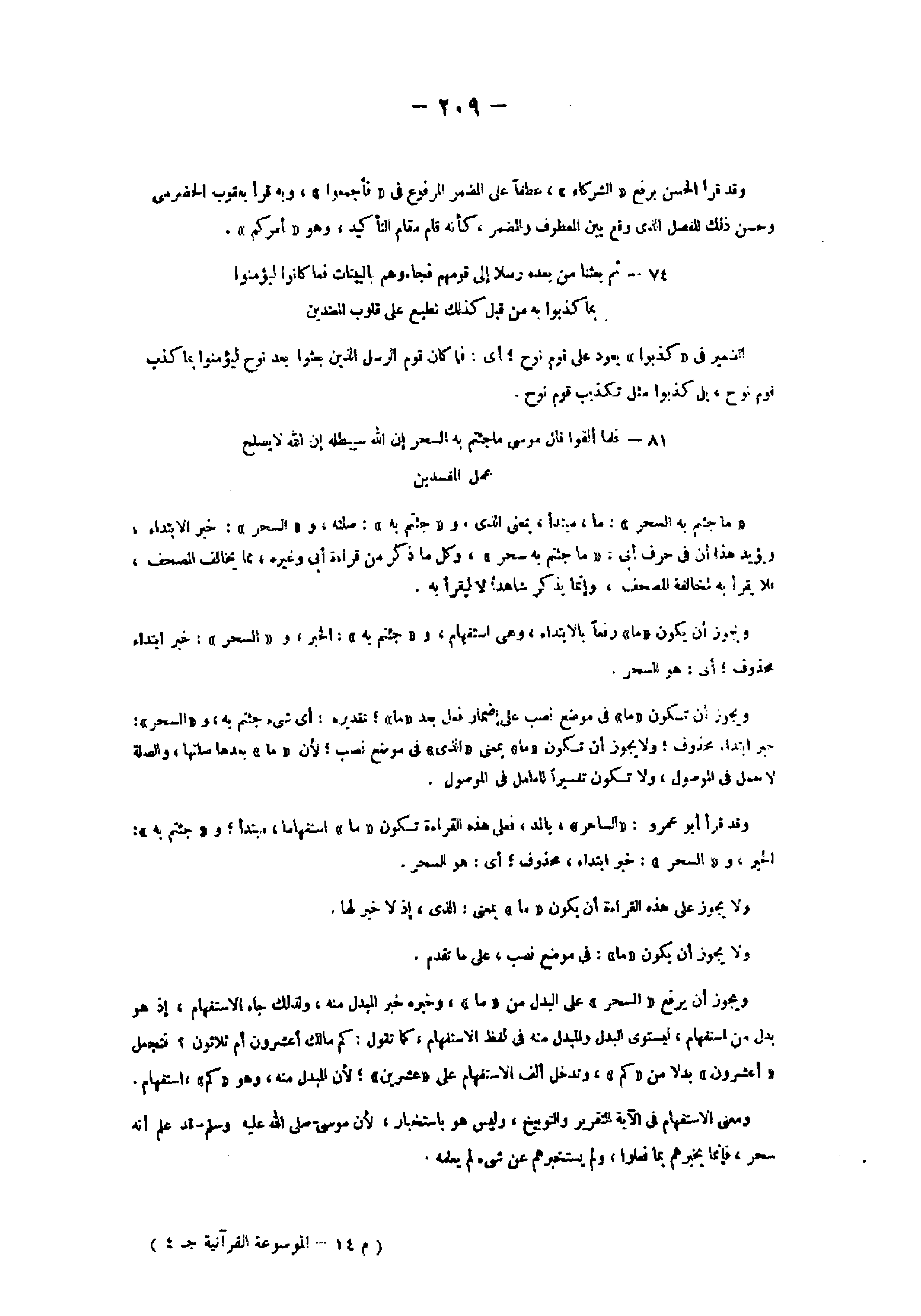 81- فَلَمَّا أَلْقَوْا قالَ مُوسى ما جِئْتُمْ بِهِ السِّحْرُ إِنَّ اللَّهَ سَيُبْطِلُهُ إِنَّ اللَّهَ لا يُصْلِحُ عَمَلَ الْمُفْسِدِينَ «ما جئتم به السحر» : ما، مبتدأ، بمعنى الذي، و «جئتم به» : صلته، و «السحر» : خبر الابتداء، ويؤيد هذا أن فى حرف أبى: «ما جئتم به سحر» ، وكل ما ذكر من قراءة أبى وغيره، مما يخالف المصحف، فلا يقرأ به لمخالفة المصحف، وإنما يذكر شاهدا لا ليقرأ به.