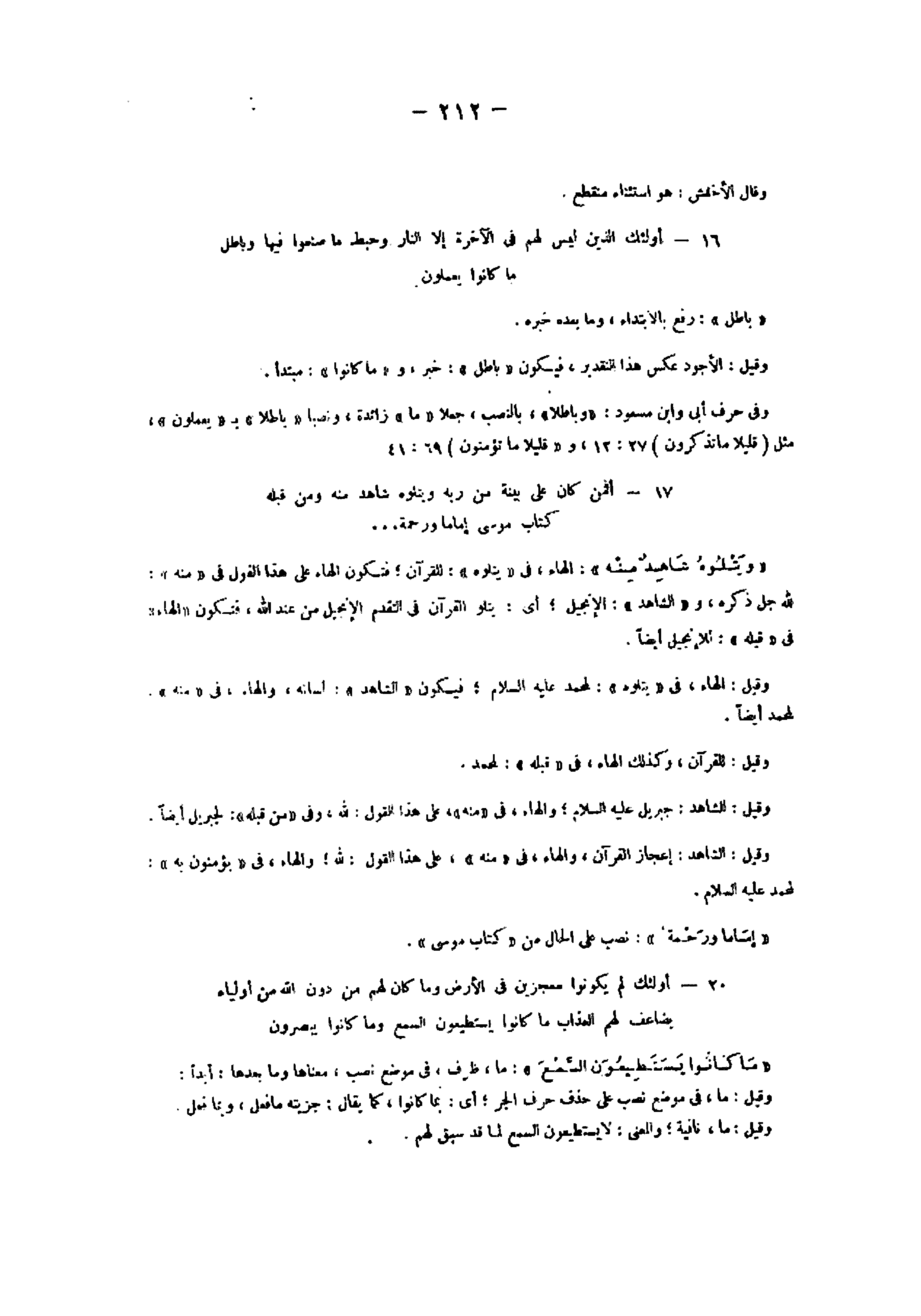 وفى حرف أبى وابن مسعود: «وباطلا» ، بالنصب، جعلا «ما» زائدة، ونصبا «باطلا» ب «يعملون» ، مثل (قَلِيلًا ما تَذَكَّرُونَ) 27: 12، و «قَلِيلًا ما تُؤْمِنُونَ» 69: 41 17- أَفَمَنْ كانَ عَلى بَيِّنَةٍ مِنْ رَبِّهِ وَيَتْلُوهُ شاهِدٌ مِنْهُ وَمِنْ قَبْلِهِ كِتابُ مُوسى إِماماً وَرَحْمَةً ...