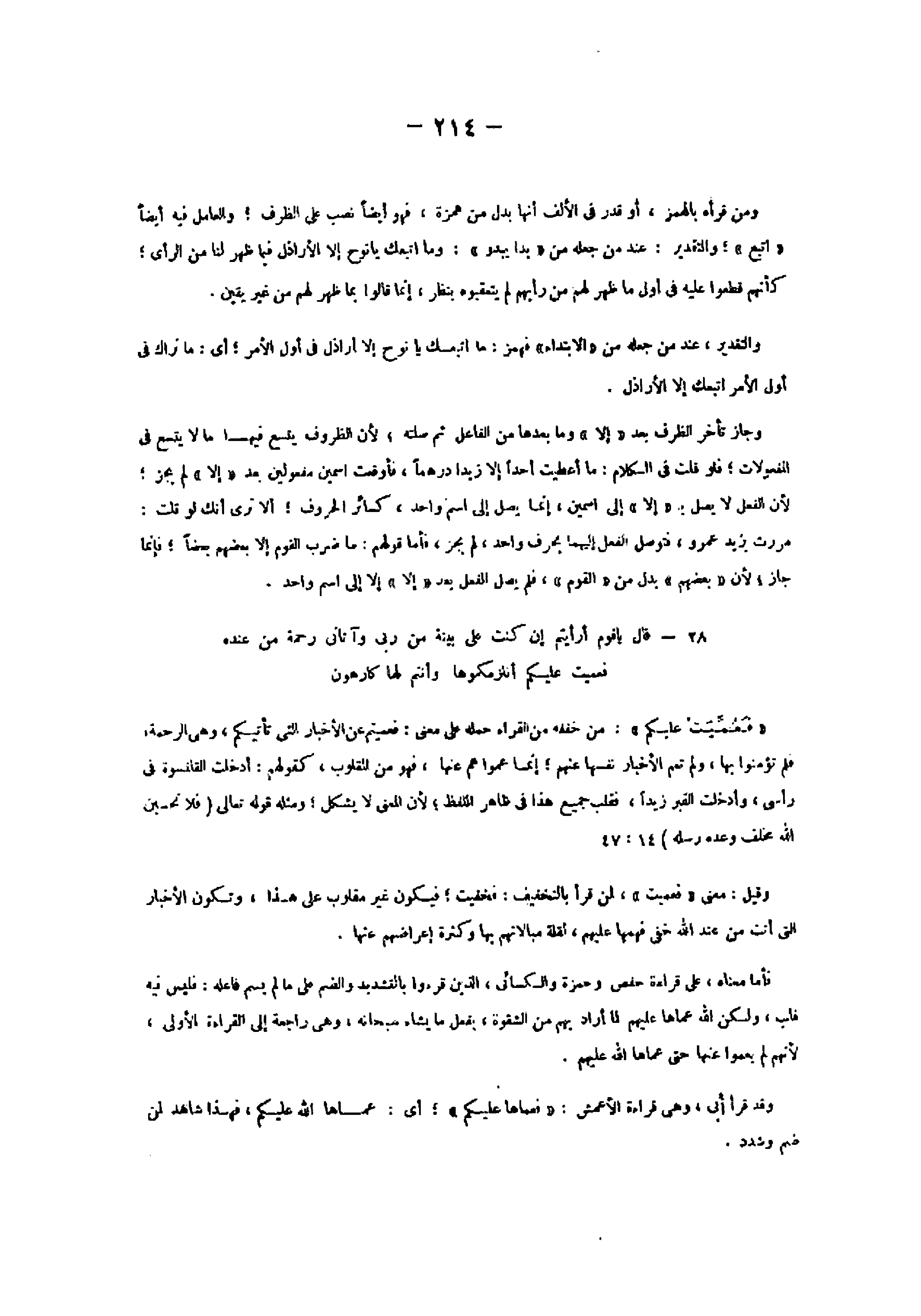 28- قالَ يا قَوْمِ أَرَأَيْتُمْ إِنْ كُنْتُ عَلى بَيِّنَةٍ مِنْ رَبِّي وَآتانِي رَحْمَةً مِنْ عِنْدِهِ فَعُمِّيَتْ عَلَيْكُمْ أَنُلْزِمُكُمُوها وَأَنْتُمْ لَها كارِهُونَ «فعمّيت عليكم» : من خففه من القراء حمله على معنى: فعميتم على الأخبار التي تأتيكم، وهى الرحمة، فلم تؤمنوا بها، ولم تعم الأخبار نفسها عنهم إنما عموا هم عنها، فهو من المقلوب، كقولهم: أدخلت القلنسوة فى رأسى، وأدخلت القبر زيدا، فقلب جميع هذا فى ظاهر اللفظ لأن المعنى لا يشكل ومثله قوله تعالى (فَلا تَحْسَبَنَّ اللَّهَ مُخْلِفَ وَعْدِهِ رُسُلَهُ) 14: 47 وقيل: معنى «فعميت» ، لمن قرأ بالتخفيف: فخفيت فيكون غير مقلوب على هذا، وتكون الأخبار التي أنت من عند الله خفى فهمها عليهم، لقلة مبالاتهم بها وكثرة إعراضهم عنها.