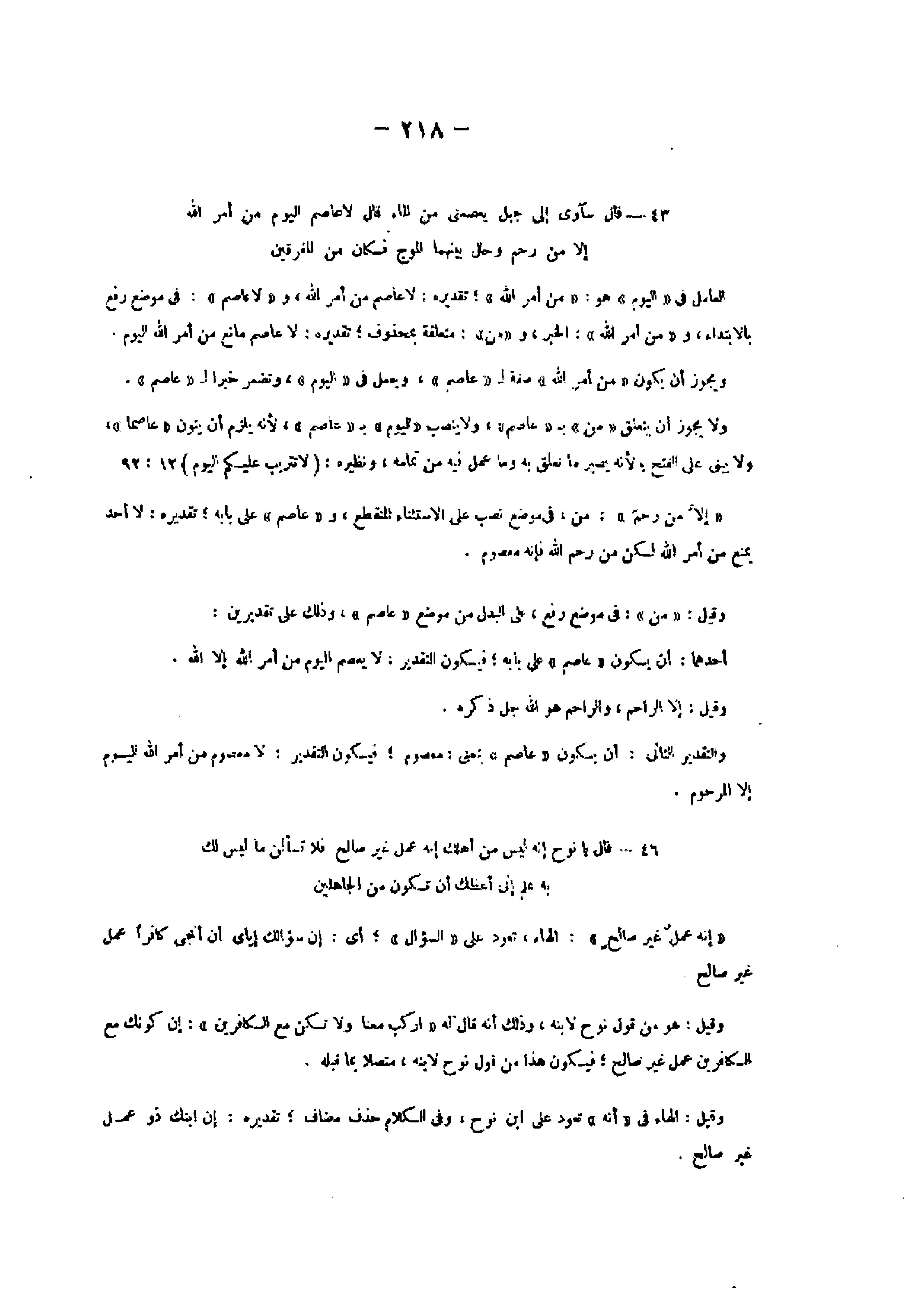 43- قالَ سَآوِي إِلى جَبَلٍ يَعْصِمُنِي مِنَ الْماءِ قالَ لا عاصِمَ الْيَوْمَ مِنْ أَمْرِ اللَّهِ إِلَّا مَنْ رَحِمَ وَحالَ بَيْنَهُمَا الْمَوْجُ فَكانَ مِنَ الْمُغْرَقِينَ العامل فى «اليوم» هو: «من أمر الله» تقديره: لا عاصم من أمر الله، و «لا عاصم» : فى موضع رفع بالابتداء، و «من أمر الله» : الخبر، و «من» : متعلقة بمحذوف تقديره: لا عاصم مانع من أمر الله اليوم.