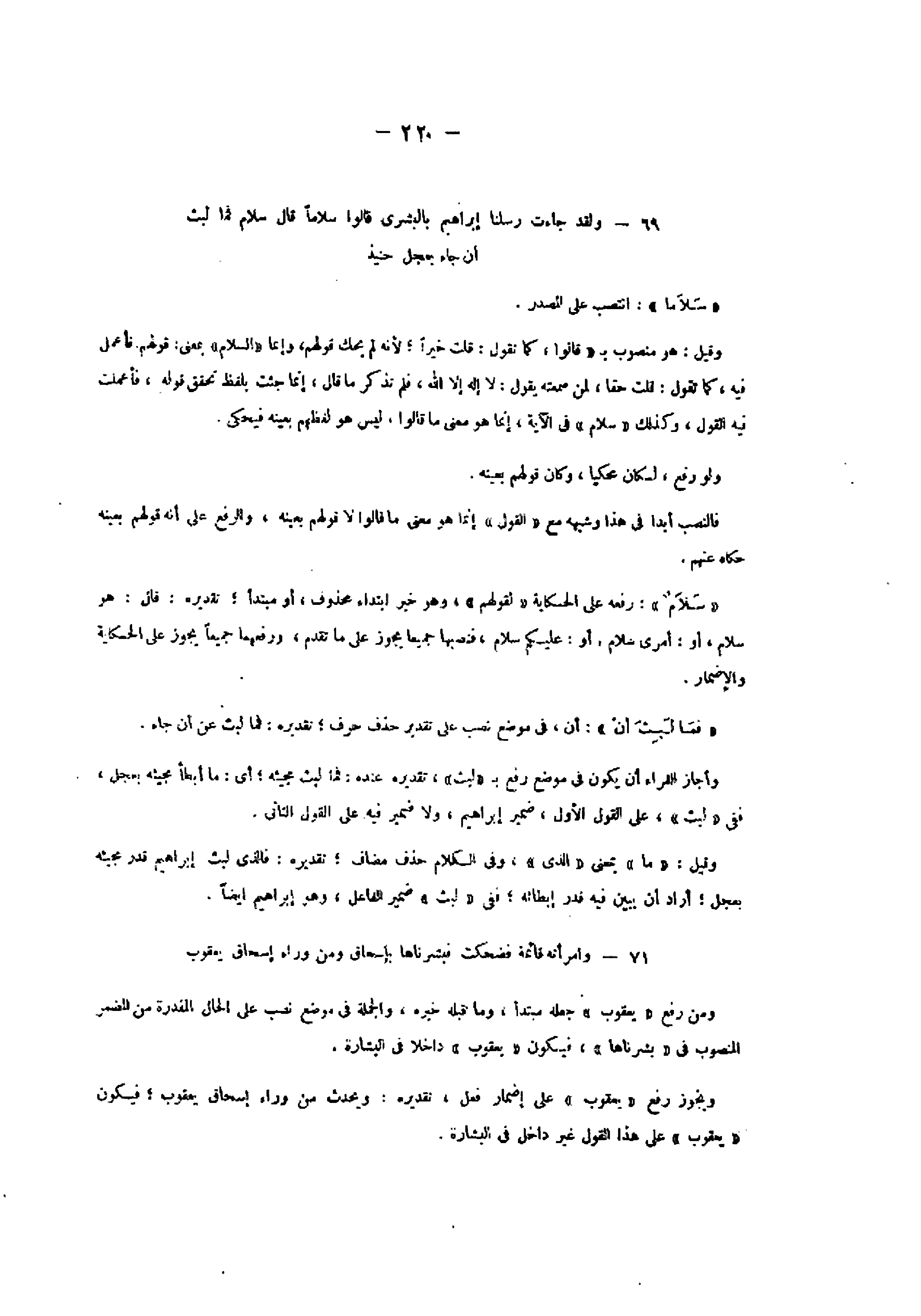 69- وَلَقَدْ جاءَتْ رُسُلُنا إِبْراهِيمَ بِالْبُشْرى قالُوا سَلاماً قالَ سَلامٌ فَما لَبِثَ أَنْ جاءَ بِعِجْلٍ حَنِيذٍ «سلاما» : انتصب على المصدر.