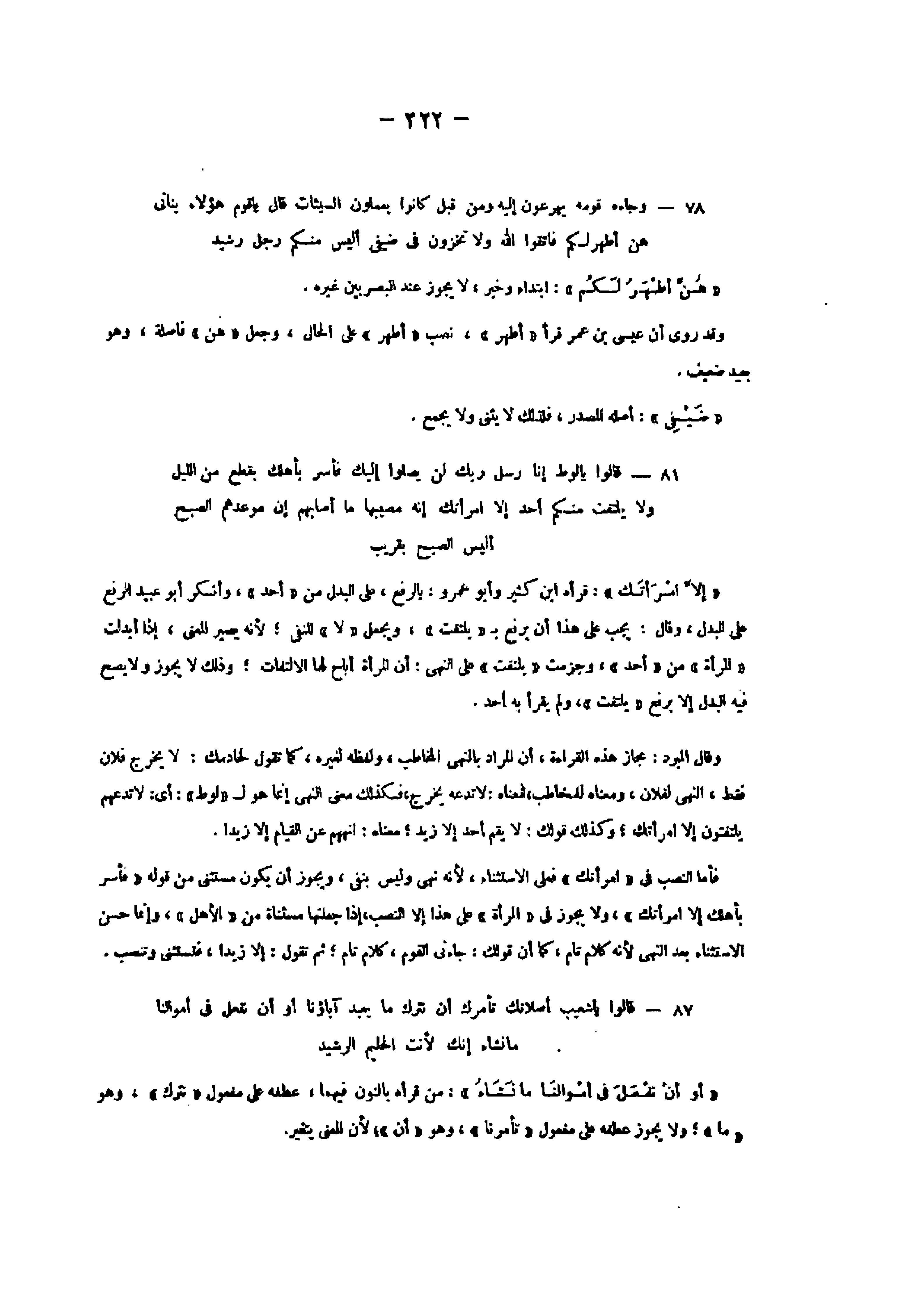 وقال المبرد: مجاز هذه القراءة، أن المراد بالنهى المخاطب، ولفظه لغيره، كما تقول لخادمك: لا يخرج فلان فقط، النهى لفلان، ومعناه للمخاطب، فمعناه: لا تدعه يخرج، فكذلك معنى النهى إنما هو ل «لوط» : أي: لا تدعهم يلتفتون إلا امرأتك وكذلك قولك: لا يقم أحد إلا زيد معناه: انههم عن القيام إلا زيدا.