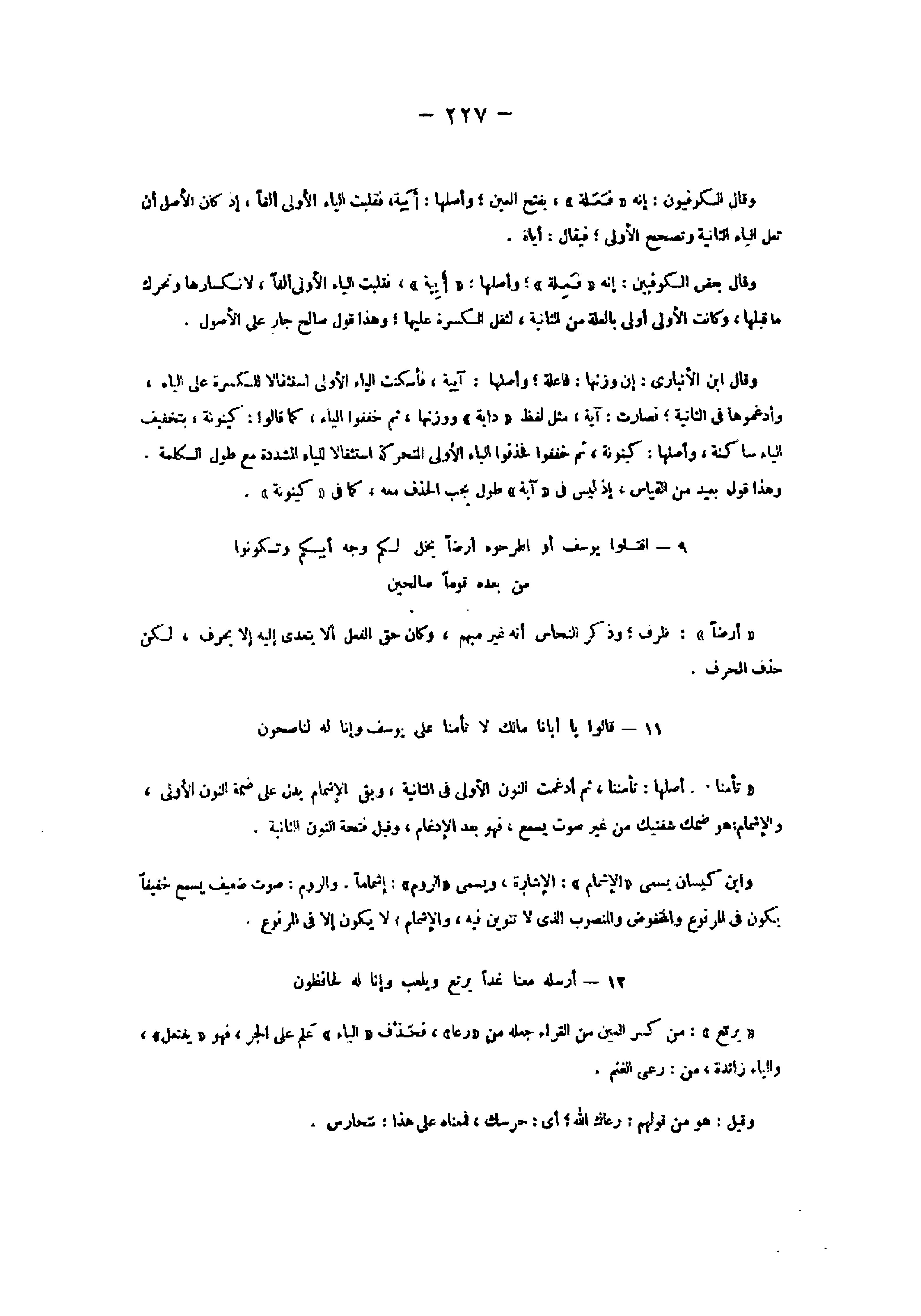 11- قالُوا يا أَبانا ما لَكَ لا تَأْمَنَّا عَلى يُوسُفَ وَإِنَّا لَهُ لَناصِحُونَ «تأمنا» أصلها: تأمننا، ثم أدغمت النون الأولى فى الثانية، وبقي الإشمام يدل على ضمة النون الأولى، والإشمام: هو ضمك شفتيك من غير صوت يسمع، فهو بعد الإدغام، وقبل فتحة النون الثانية.