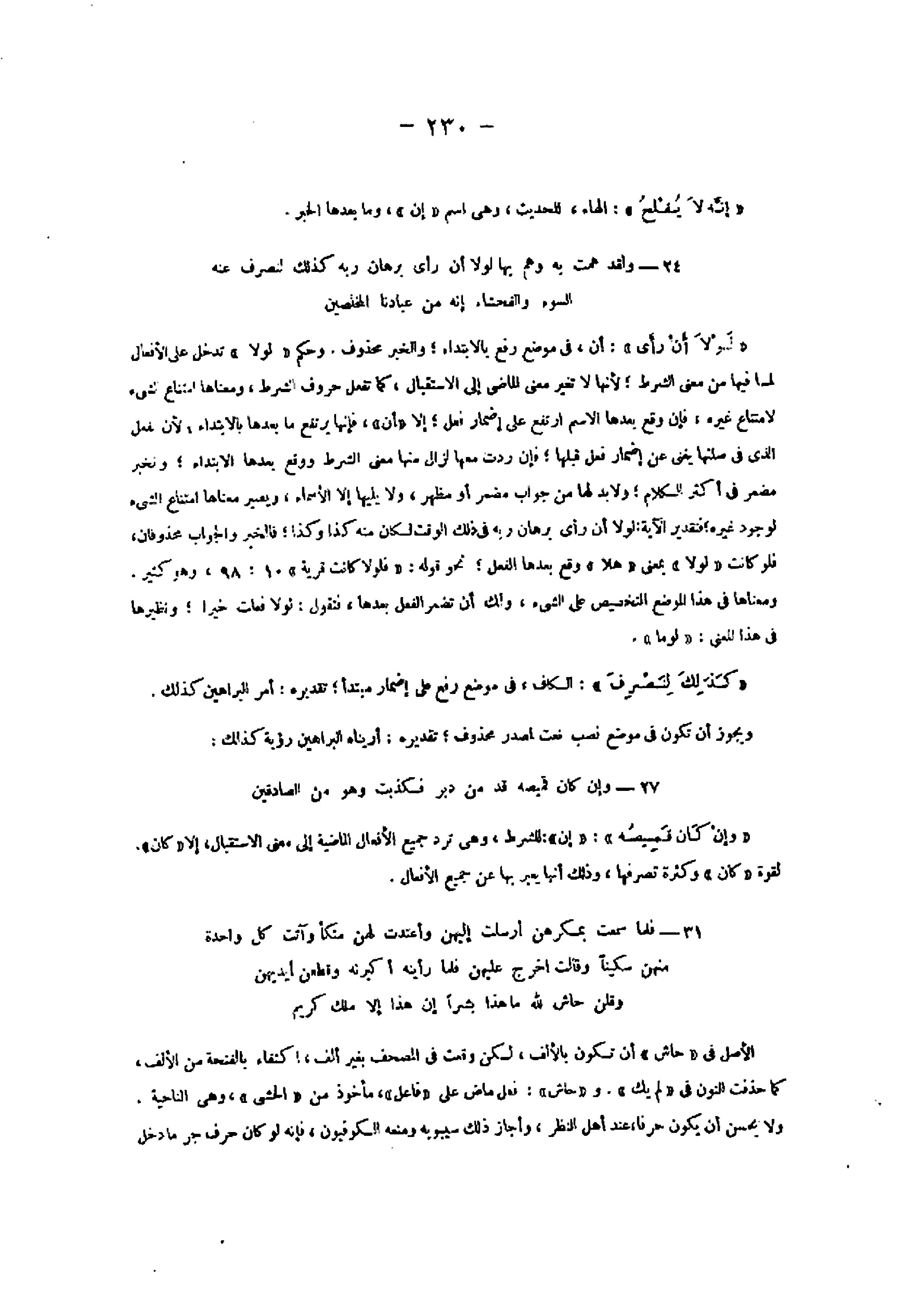 24- وَلَقَدْ هَمَّتْ بِهِ وَهَمَّ بِها لَوْلا أَنْ رَأى بُرْهانَ رَبِّهِ كَذلِكَ لِنَصْرِفَ عَنْهُ السُّوءَ وَالْفَحْشاءَ إِنَّهُ مِنْ عِبادِنَا الْمُخْلَصِينَ «لولا أن رأى» : أن، فى موضع رفع بالابتداء والخبر محذوف. وحكم «لولا» تدخل على الأفعال لما فيها من معنى الشرط لأنها لا تغير معنى الماضي إلى الاستقبال، كما تفعل حروف الشرط، ومعناها امتناع الشيء لامتناع غيره، فإن وقع بعدها الاسم ارتفع على إضمار فعل إلا «أن» ، فإنها يرتفع ما بعدها بالابتداء، لأن الفعل الذي فى صلتها يغنى عن إضمار فعل قبلها فإن ردت معها لزال منها معنى الشرط ووقع بعدها الابتداء والخبر مضمر فى أكثر الكلام ولا بد لها من جواب مضمر أو مظهر، ولا يليها إلا الأسماء، ويصير معناها امتناع الشيء لوجود غيره فتقدير الآية: لولا أن رأى برهان ربه فى ذلك الوقت لكان منه كذا وكذا فالخبر والجواب محذوفان، فلو كانت «لولا» بمعنى «هلا» وقع بعدها الفعل نحو قوله: «فَلَوْلا كانَتْ قَرْيَةٌ» 10: 98، وهو كثير.