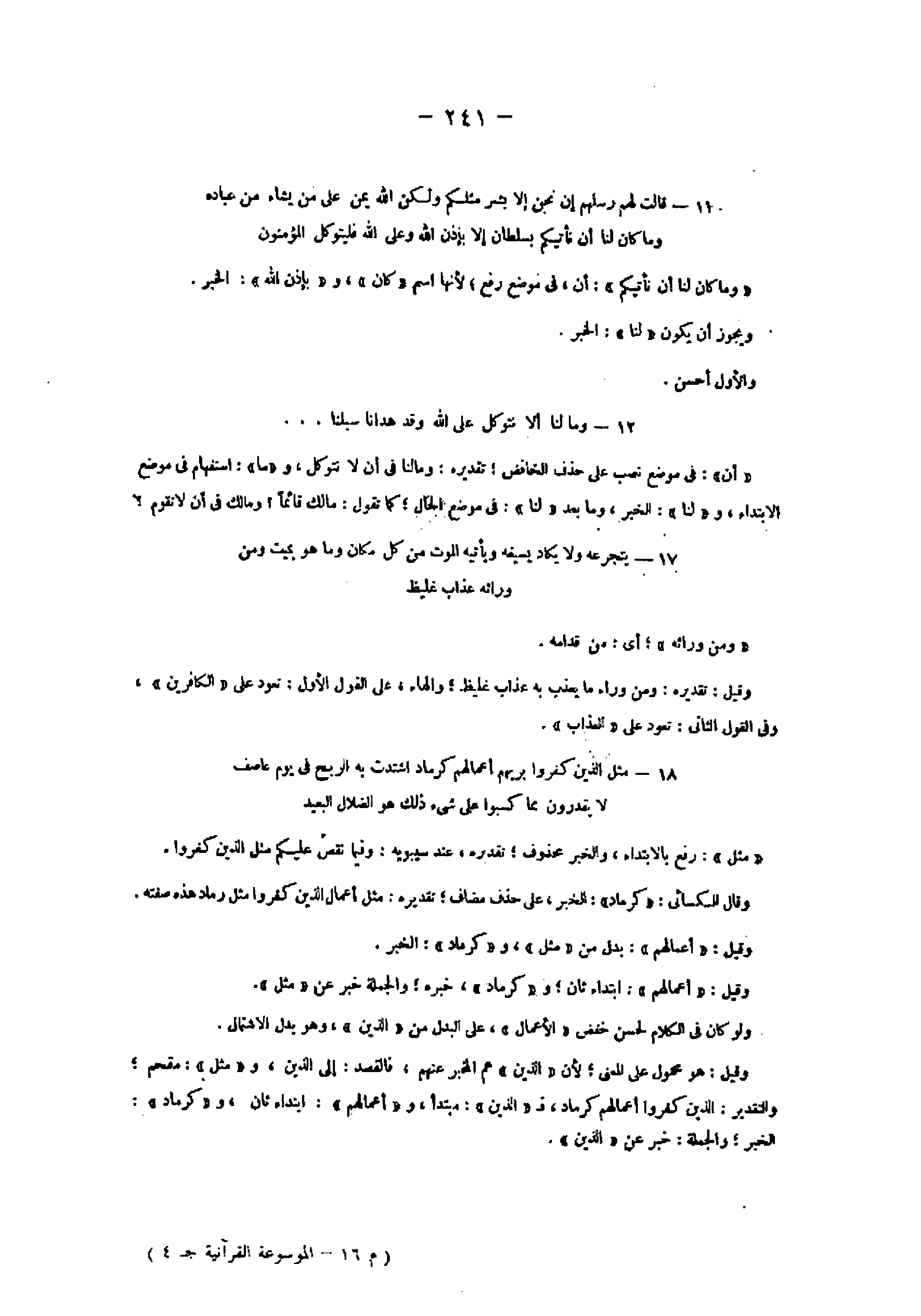 وقيل: هو محمول على المعنى لأن «الذين» هم المخبر عنهم، فالقصد: إلى الذين، و «مثل» : مقحم، والتقدير: الذين كفروا أعمالهم كرماد، ف «الذين» : مبتدأ، و «أعمالهم» : ابتداء ثان، و «كرماد» :