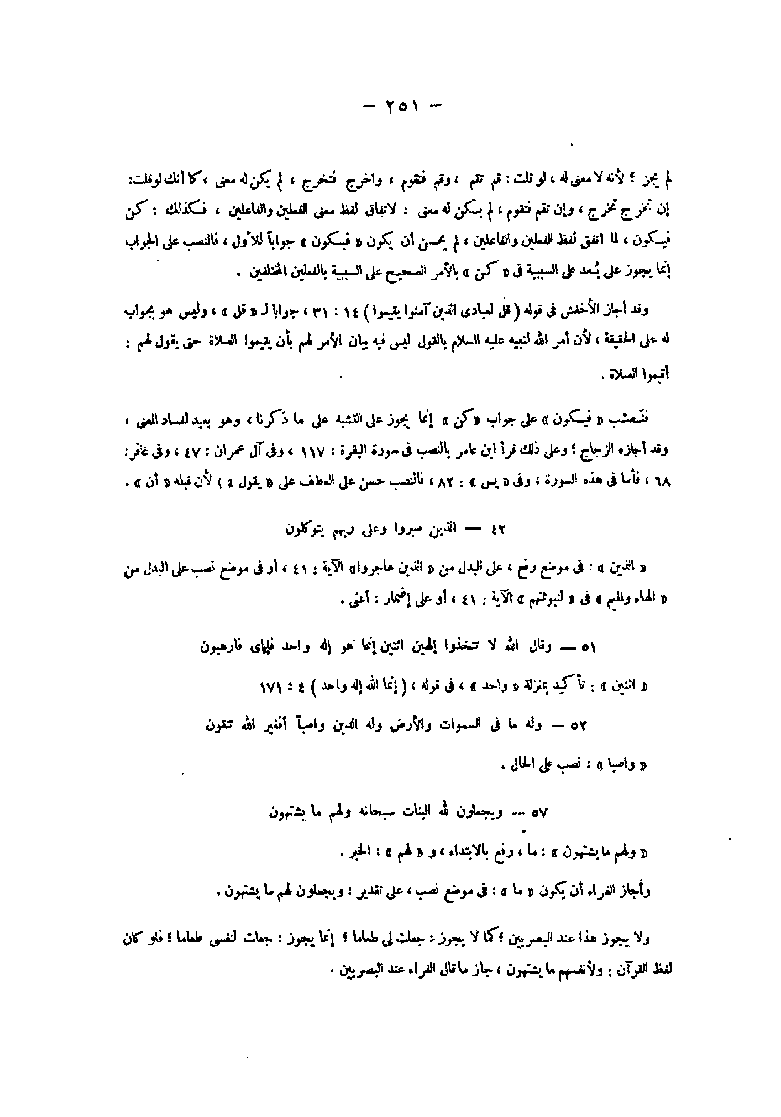 51- وَقالَ اللَّهُ لا تَتَّخِذُوا إِلهَيْنِ اثْنَيْنِ إِنَّما هُوَ إِلهٌ واحِدٌ فَإِيَّايَ فَارْهَبُونِ «اثنين» : تأكيد بمنزلة «واحد» ، فى قوله، (إِنَّمَا اللَّهُ إِلهٌ واحِدٌ) 4: 171 52- وَلَهُ ما فِي السَّماواتِ وَالْأَرْضِ وَلَهُ الدِّينُ واصِباً أَفَغَيْرَ اللَّهِ تَتَّقُونَ «واصبا» : نصب على الحال.