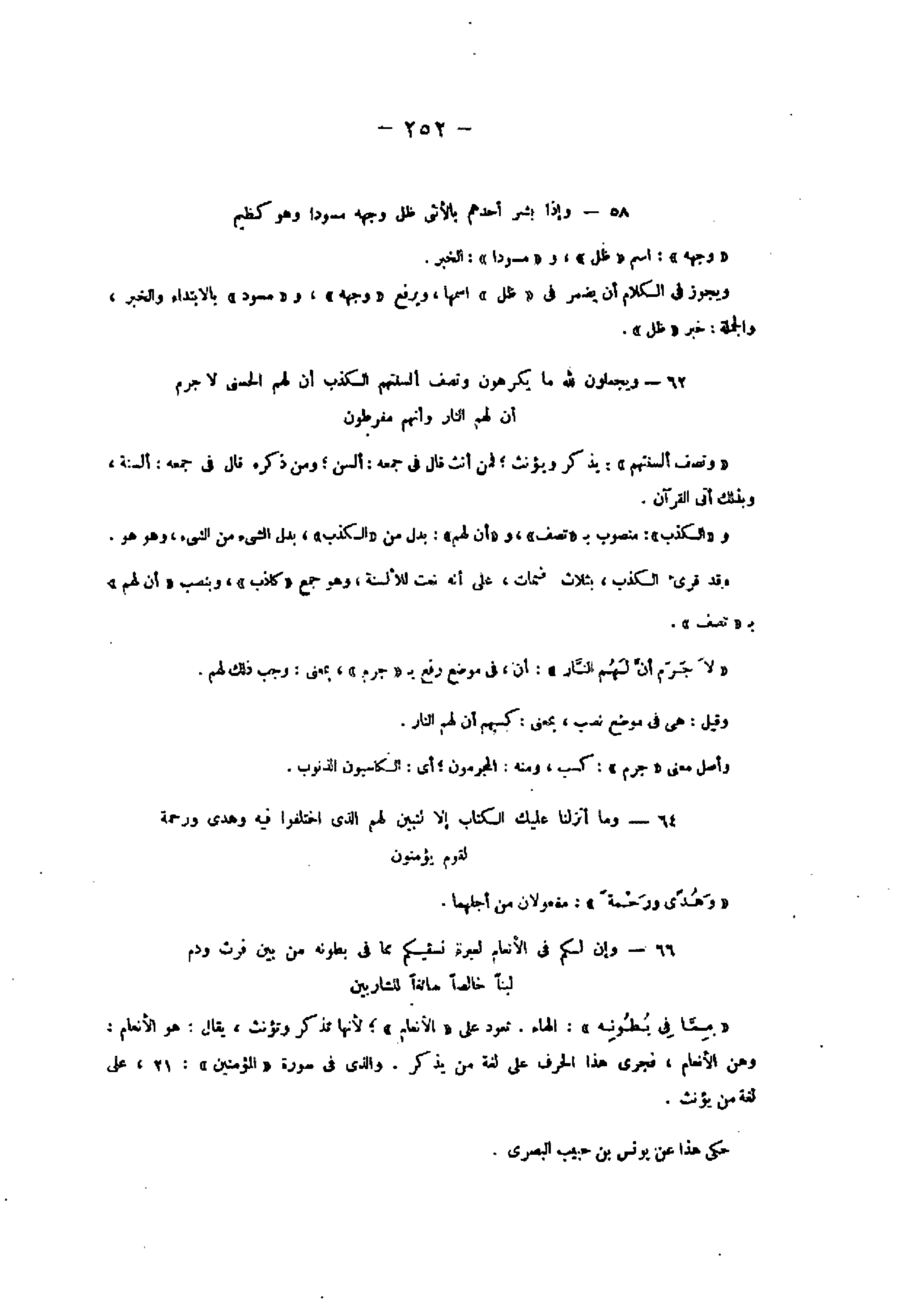 58- وَإِذا بُشِّرَ أَحَدُهُمْ بِالْأُنْثى ظَلَّ وَجْهُهُ مُسْوَدًّا وَهُوَ كَظِيمٌ «وجهه» : اسم «ظل» ، و «مسودا» : الخبر.