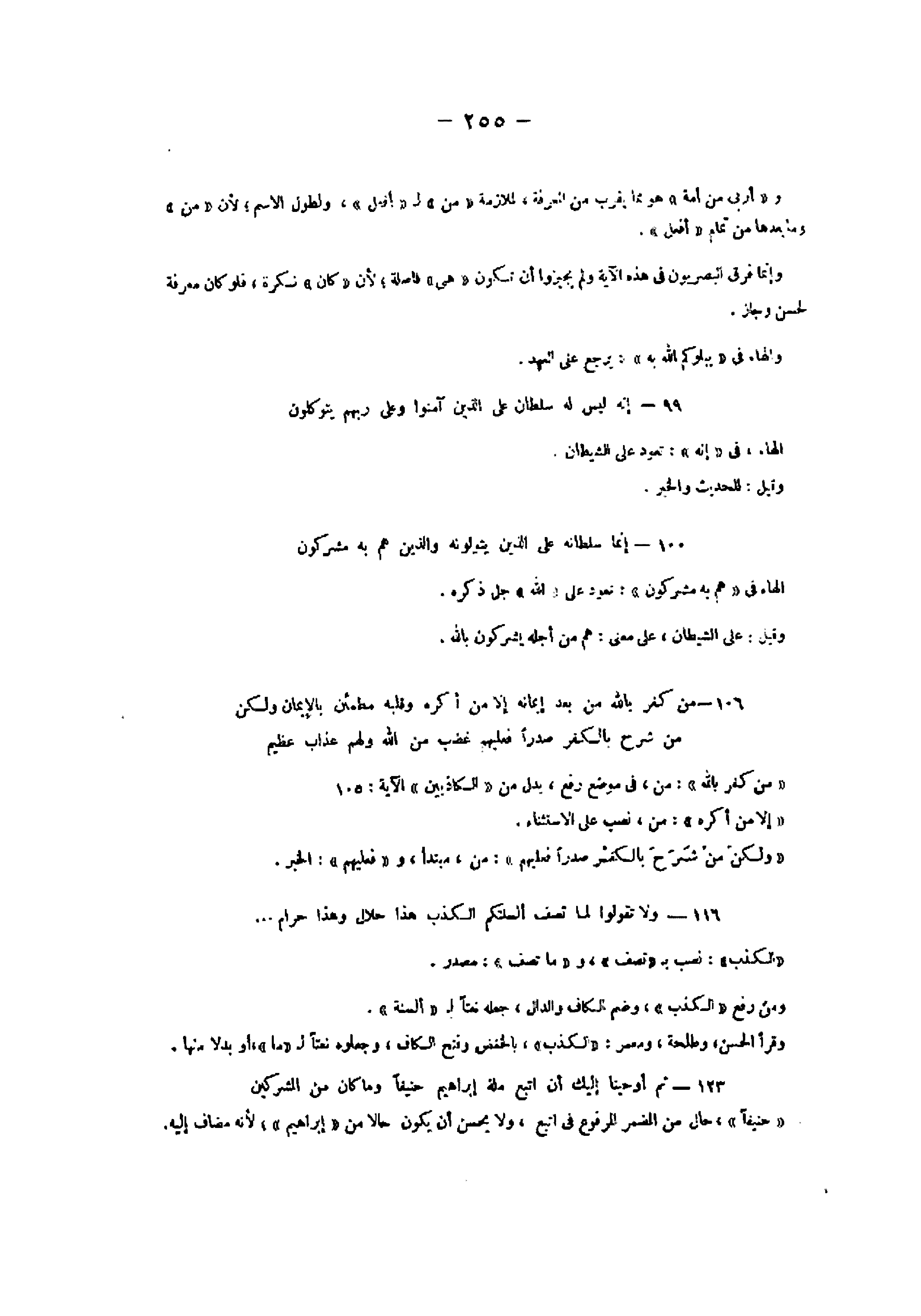 123- ثُمَّ أَوْحَيْنا إِلَيْكَ أَنِ اتَّبِعْ مِلَّةَ إِبْراهِيمَ حَنِيفاً وَما كانَ مِنَ الْمُشْرِكِينَ «حنيفا» ، حال من المضمر المرفوع فى اتبع، ولا يحسن أن يكون حالا من «إبراهيم» لأنه مضاف إليه.