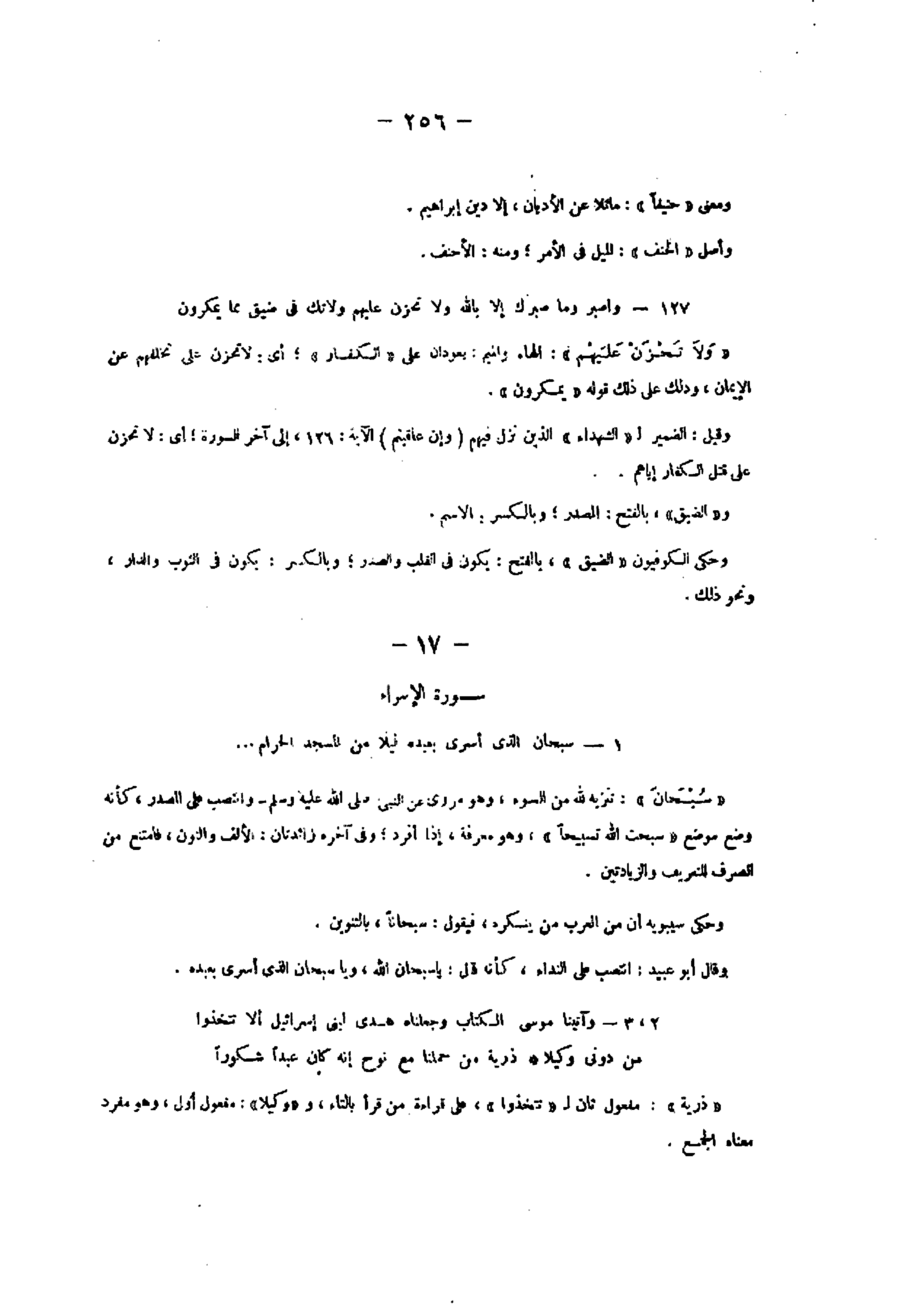 2، 3- وَآتَيْنا مُوسَى الْكِتابَ وَجَعَلْناهُ هُدىً لِبَنِي إِسْرائِيلَ أَلَّا تَتَّخِذُوا مِنْ دُونِي وَكِيلًا ذُرِّيَّةَ مَنْ حَمَلْنا مَعَ نُوحٍ إِنَّهُ كانَ عَبْداً شَكُوراً «ذرية» : مفعول ثان ل «تتخذوا» ، على قراءة من قرأ بالتاء، و «وكيلا» : مفعول أول، وهو مفرد معناه الجمع.