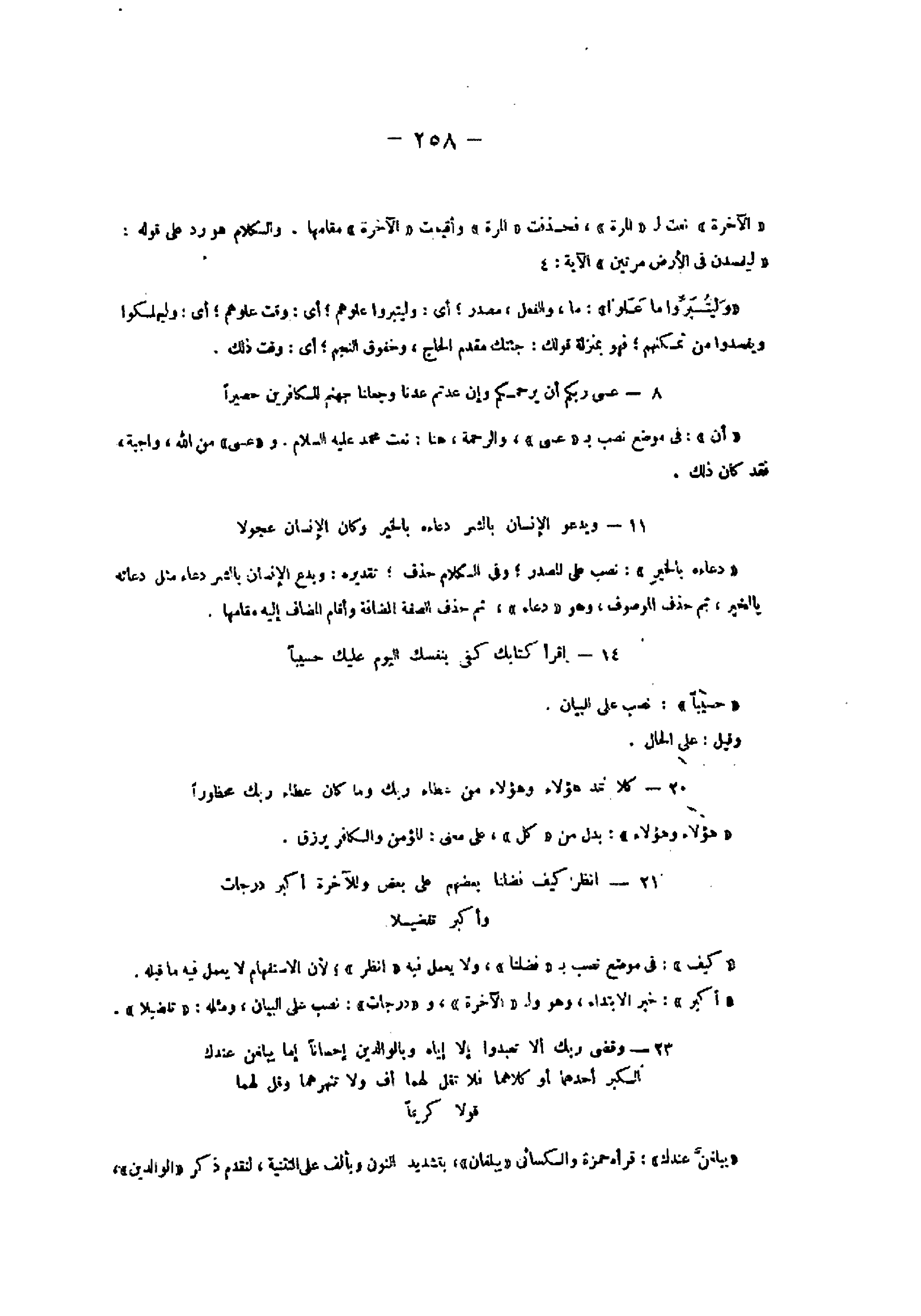 11- وَيَدْعُ الْإِنْسانُ بِالشَّرِّ دُعاءَهُ بِالْخَيْرِ وَكانَ الْإِنْسانُ عَجُولًا «دعاءه بالخير» : نصب على المصدر وفى الكلام حذف تقديره: ويدع الإنسان بالشر دعاء مثل دعائه بالخير، ثم حذف الموصوف، وهو «دعاء» ، ثم حذف الصفة المضافة وأقام المضاف إليه مقامها.