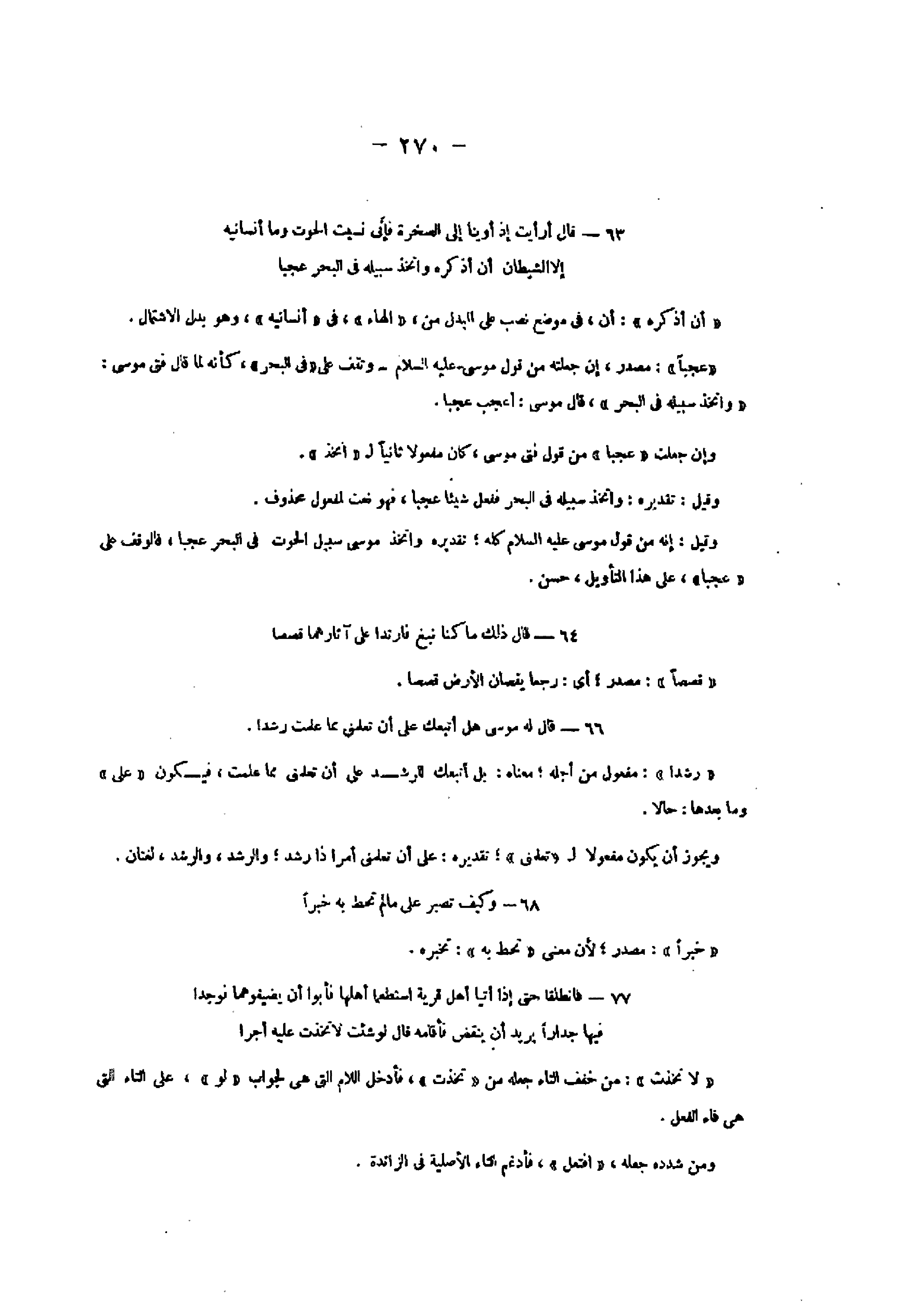 63- قالَ أَرَأَيْتَ إِذْ أَوَيْنا إِلَى الصَّخْرَةِ فَإِنِّي نَسِيتُ الْحُوتَ وَما أَنْسانِيهُ إِلَّا الشَّيْطانُ أَنْ أَذْكُرَهُ وَاتَّخَذَ سَبِيلَهُ فِي الْبَحْرِ عَجَباً «أن أذكره» : أن، فى موضع نصب على البدل من، «الهاء» ، فى «أنسانيه» ، وهو بدل الاشتمال.