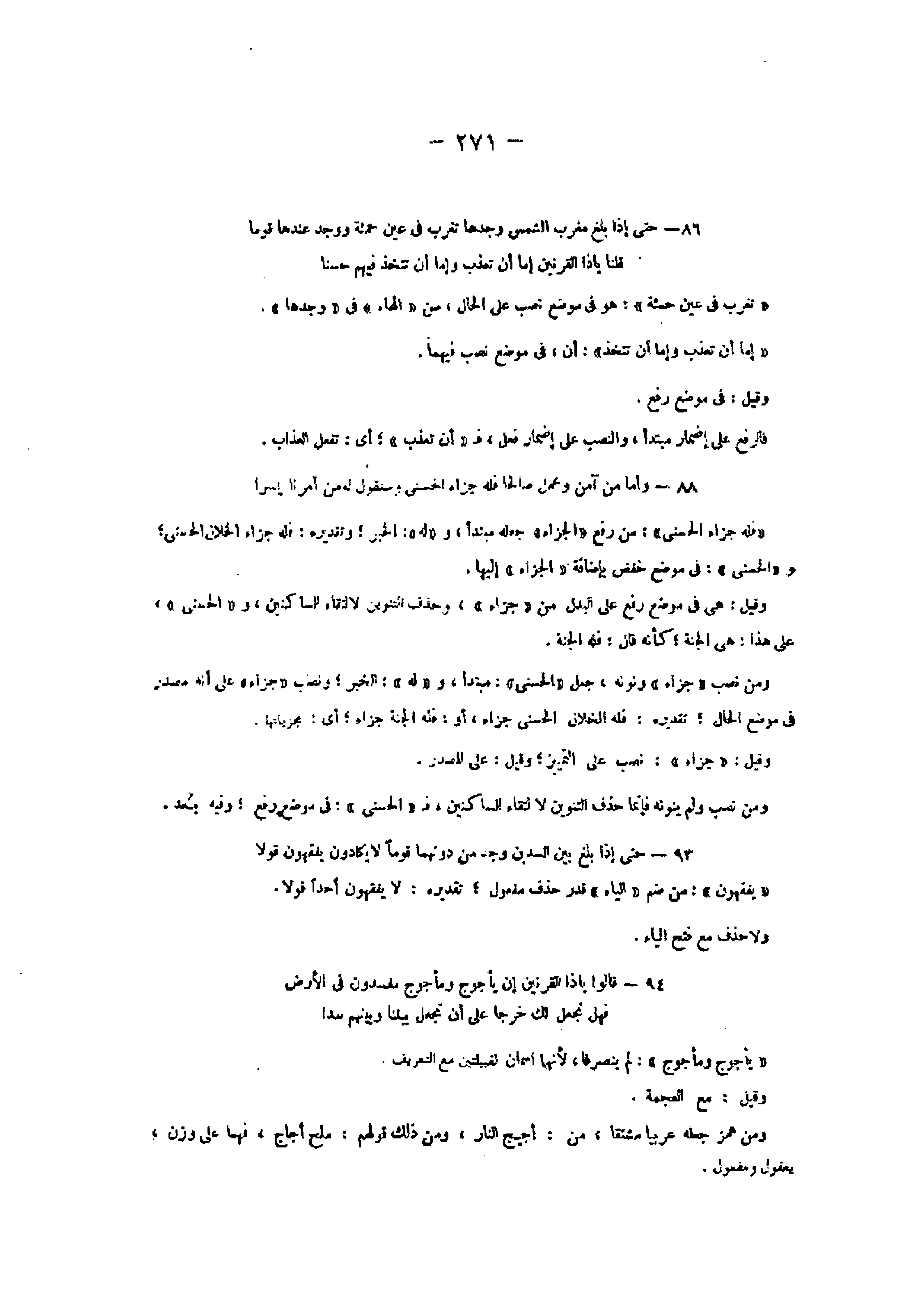 86- حَتَّى إِذا بَلَغَ مَغْرِبَ الشَّمْسِ وَجَدَها تَغْرُبُ فِي عَيْنٍ حَمِئَةٍ وَوَجَدَ عِنْدَها قَوْماً قُلْنا يا ذَا الْقَرْنَيْنِ إِمَّا أَنْ تُعَذِّبَ وَإِمَّا أَنْ تَتَّخِذَ فِيهِمْ حُسْناً «تغرب فى عين حمئة» : هو فى موضع نصب على الحال، من «الهاء» فى «وجدها» .
