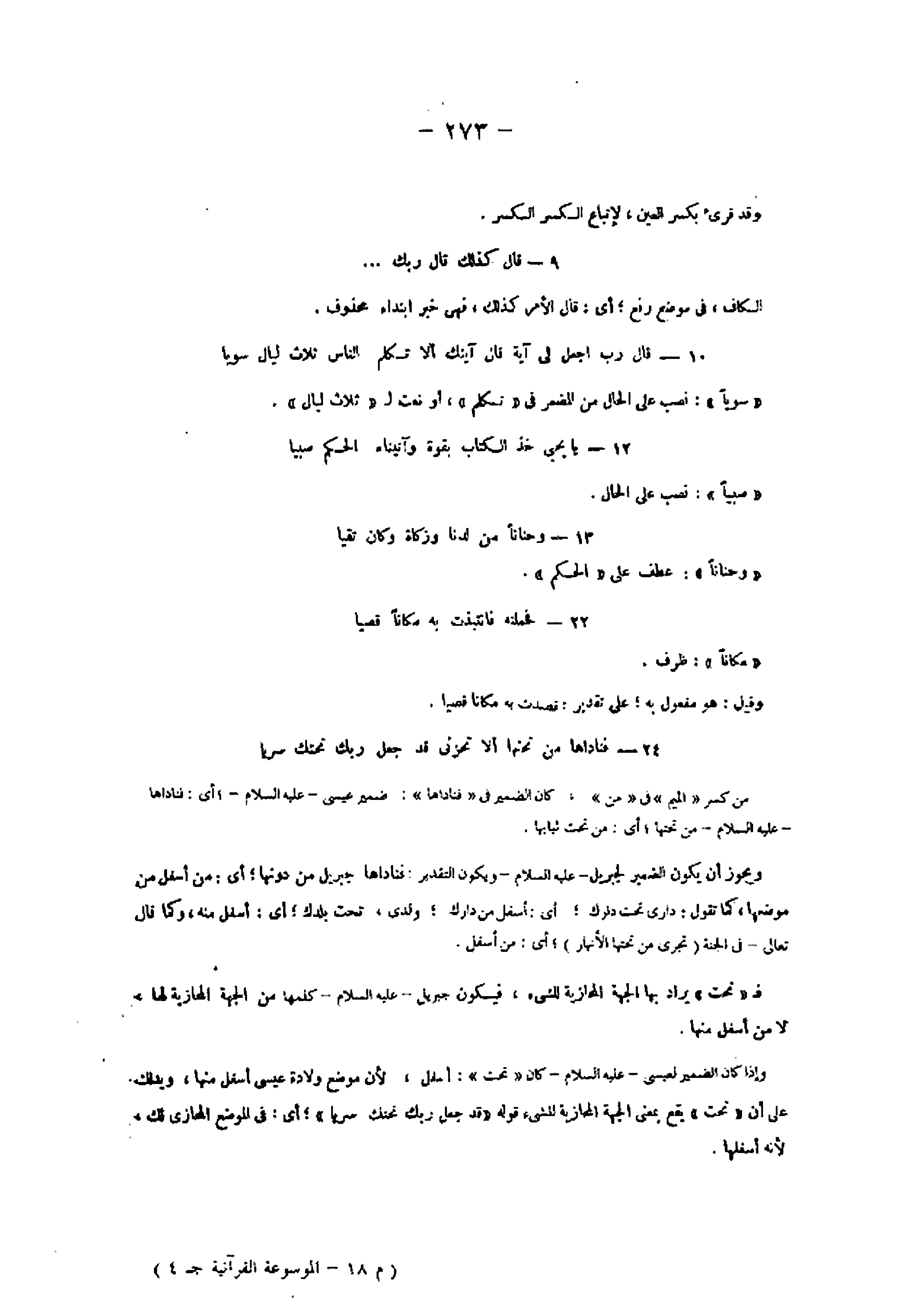 24- فَناداها مِنْ تَحْتِها أَلَّا تَحْزَنِي قَدْ جَعَلَ رَبُّكِ تَحْتَكِ سَرِيًّا من كسر «الميم» فى «من» ، كان الضمير فى «فناداها» : ضمير عيسى- عليه السلام-، أي: فناداها- عليه السلام- من تحتها أي: من تحت ثيابها.