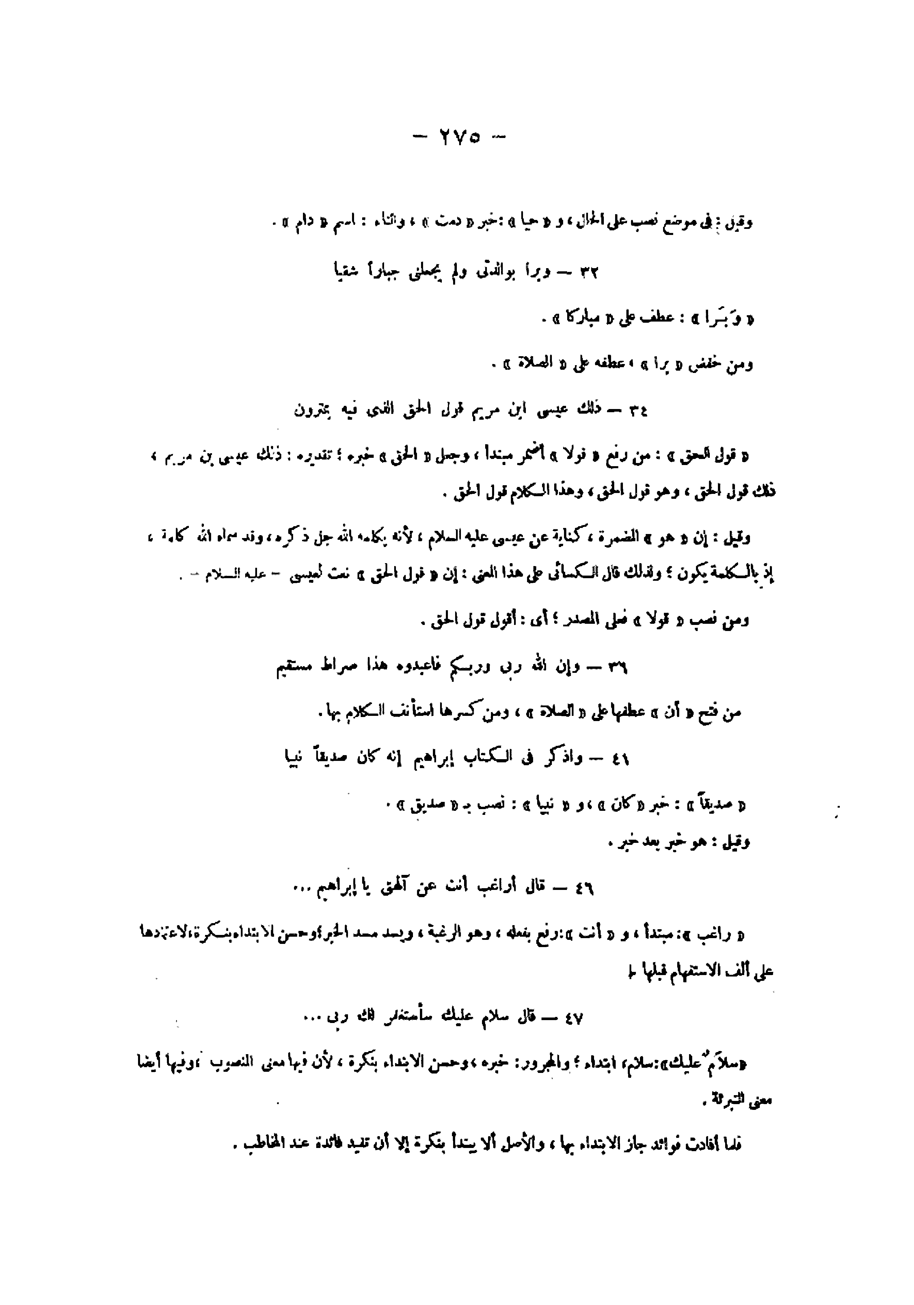 34- ذلِكَ عِيسَى ابْنُ مَرْيَمَ قَوْلَ الْحَقِّ الَّذِي فِيهِ يَمْتَرُونَ «قول الحق» : من رفع «قولا» أضمر مبتدأ، وجعل «الحق» خبره تقديره: ذلك عيسى بن مريم، ذلك قول الحق، وهو قول الحق، وهذا الكلام قول الحق.