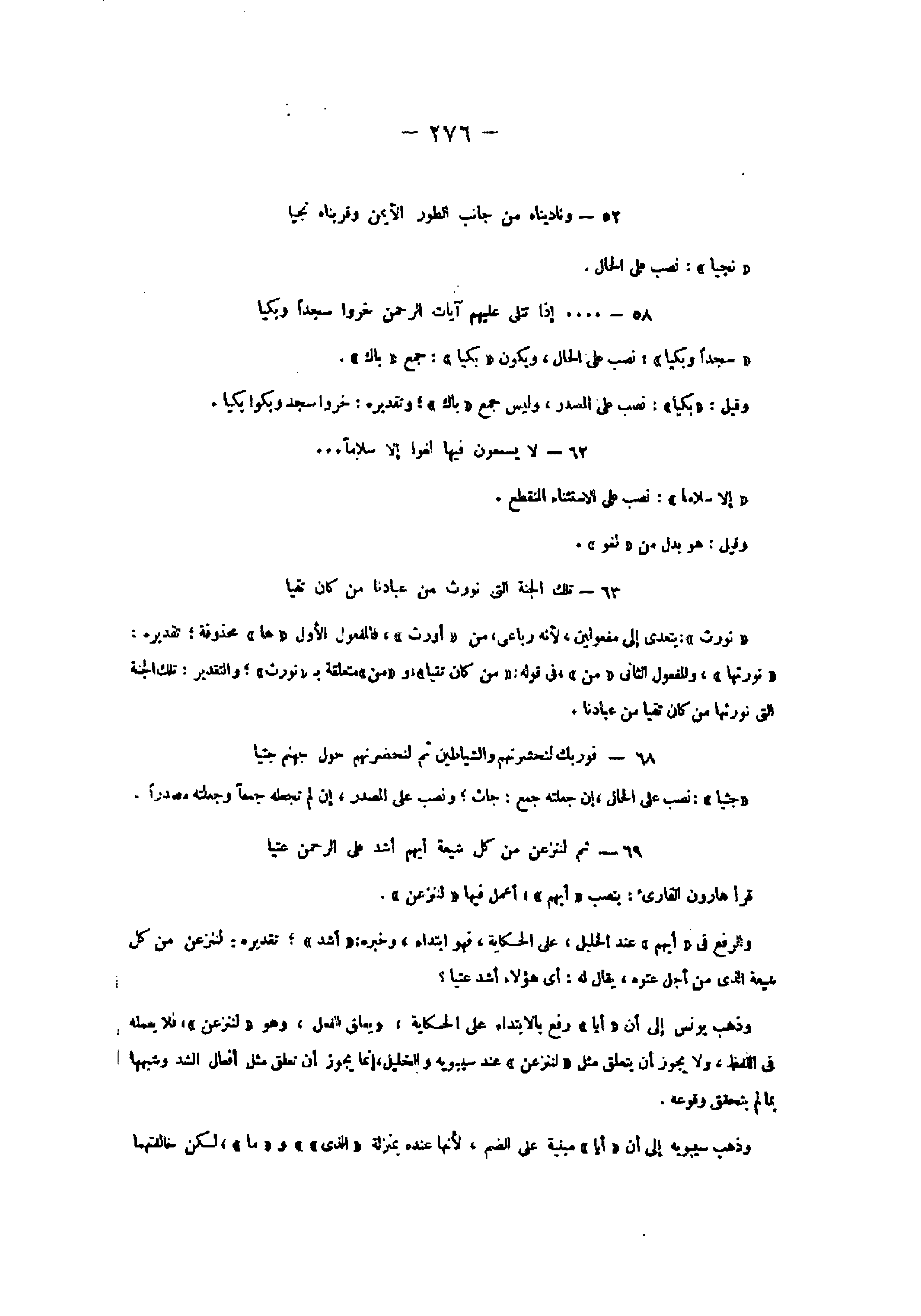 58- ... إِذا تُتْلى عَلَيْهِمْ آياتُ الرَّحْمنِ خَرُّوا سُجَّداً وَبُكِيًّا «سجدا وبكيا» : نصب على الحال، ويكون «بكيا» : جمع «باك» .