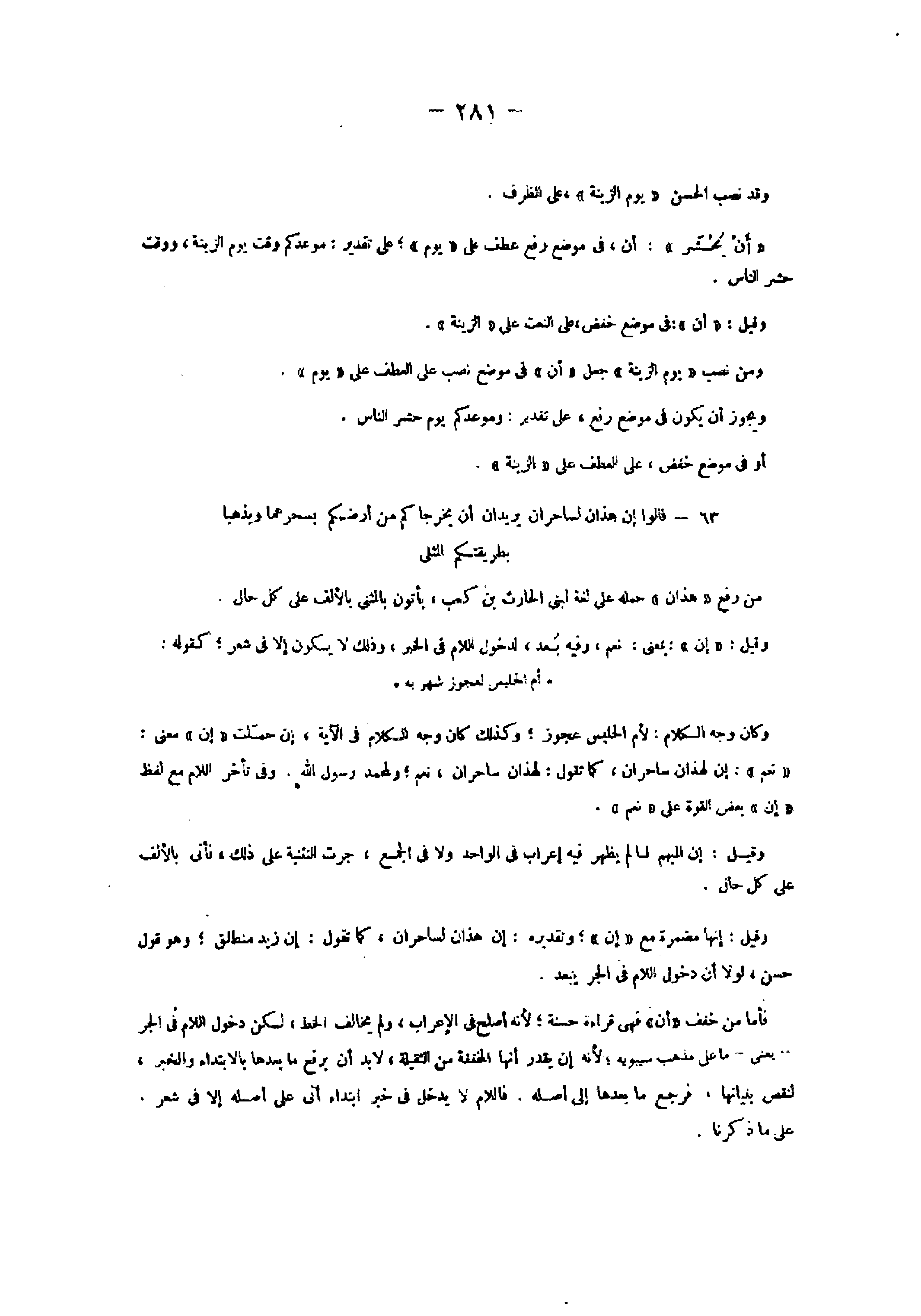 63- قالُوا إِنْ هذانِ لَساحِرانِ يُرِيدانِ أَنْ يُخْرِجاكُمْ مِنْ أَرْضِكُمْ بِسِحْرِهِما وَيَذْهَبا بِطَرِيقَتِكُمُ الْمُثْلى من رفع «هذان» حمله على لغة لبنى الحارث بن كعب، يأتون بالمثنى بالألف على كل حال.