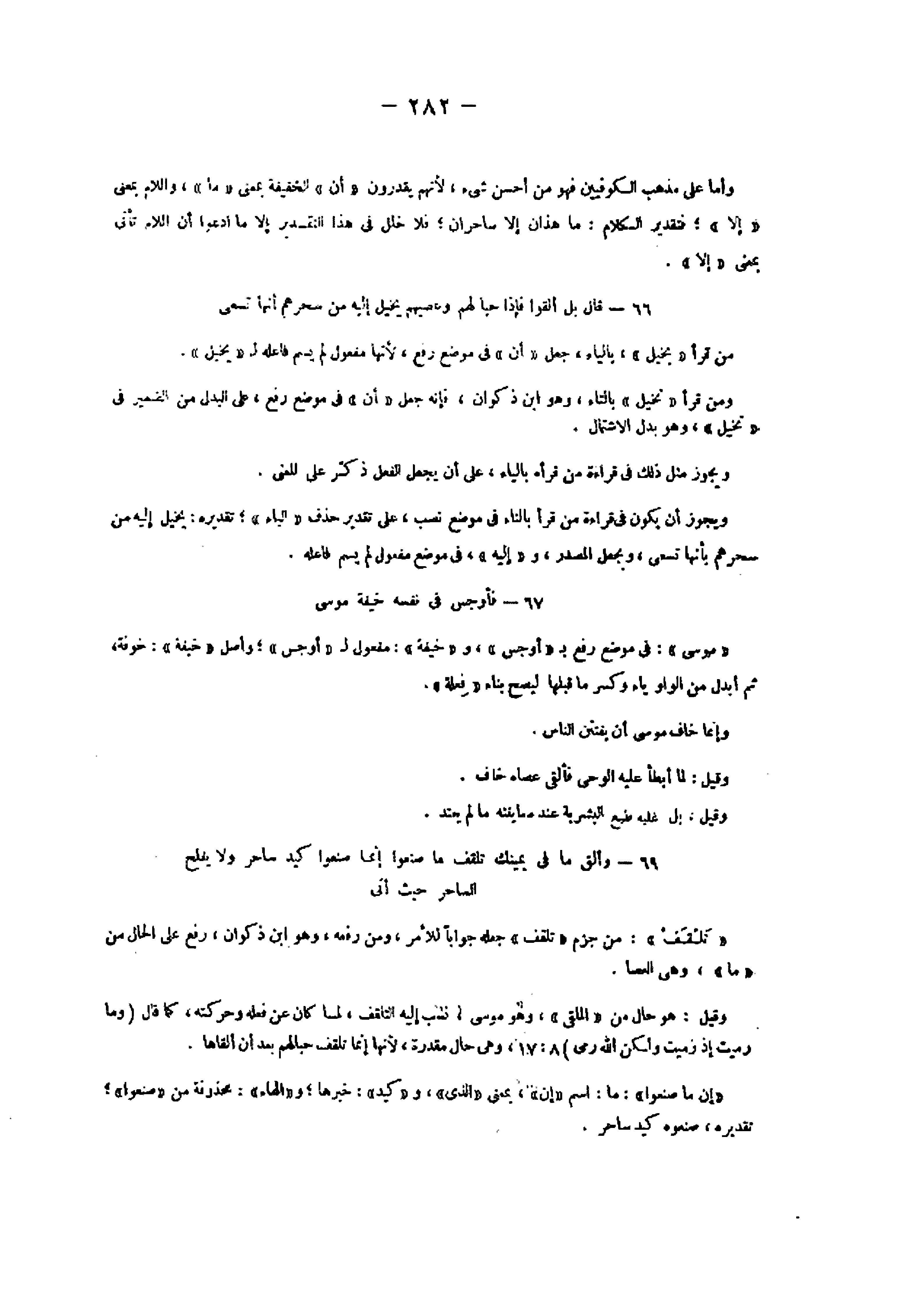 66- قالَ بَلْ أَلْقُوا فَإِذا حِبالُهُمْ وَعِصِيُّهُمْ يُخَيَّلُ إِلَيْهِ مِنْ سِحْرِهِمْ أَنَّها تَسْعى من قرأ «يخيل» ، بالياء، جعل «أن» فى موضع رفع، لأنها مفعول لم يسم فاعله ل «يخيل» .