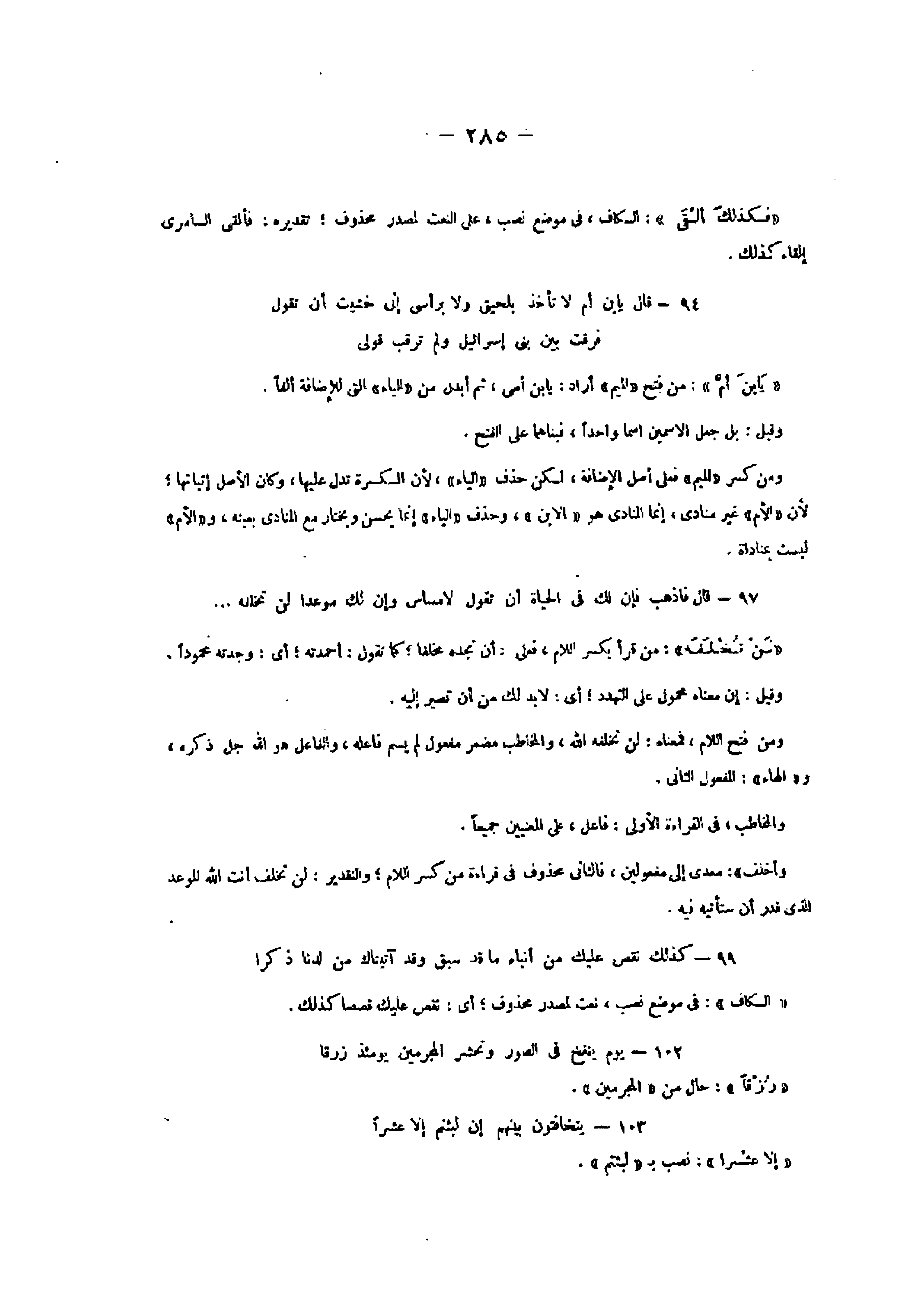 103- يَتَخافَتُونَ بَيْنَهُمْ إِنْ لَبِثْتُمْ إِلَّا عَشْراً «إلا عشرا» : نصب ب «لبثتم» .