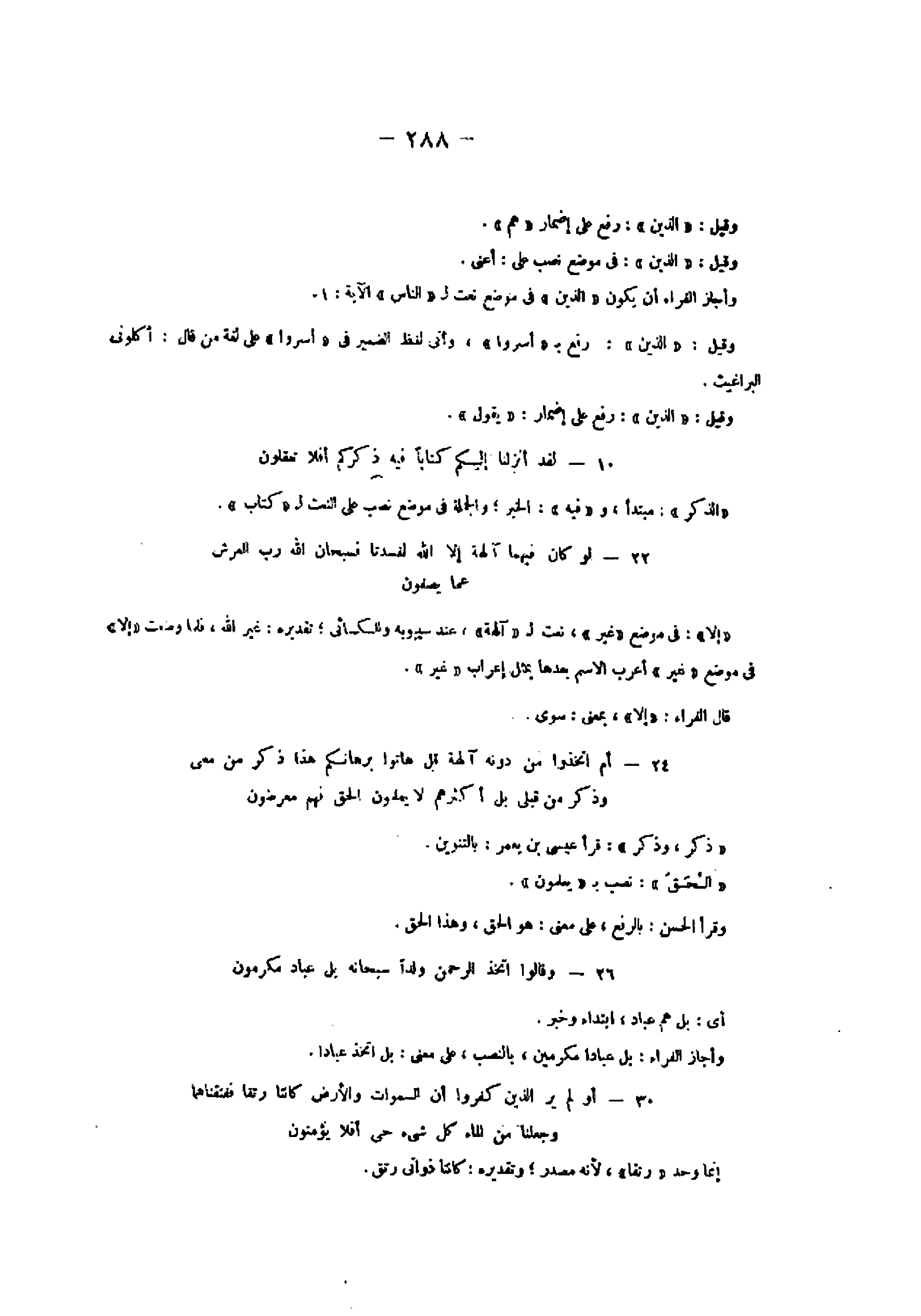 22- لَوْ كانَ فِيهِما آلِهَةٌ إِلَّا اللَّهُ لَفَسَدَتا فَسُبْحانَ اللَّهِ رَبِّ الْعَرْشِ عَمَّا يَصِفُونَ «إلا» : فى موضع «غير» ، نعت ل «آلهة» ، عند سيبويه والكسائي، تقديره: غير الله، فلما وضعت «إلا» فى موضع «غير» أعرب الاسم بعدها بمثل إعراب «غير» .