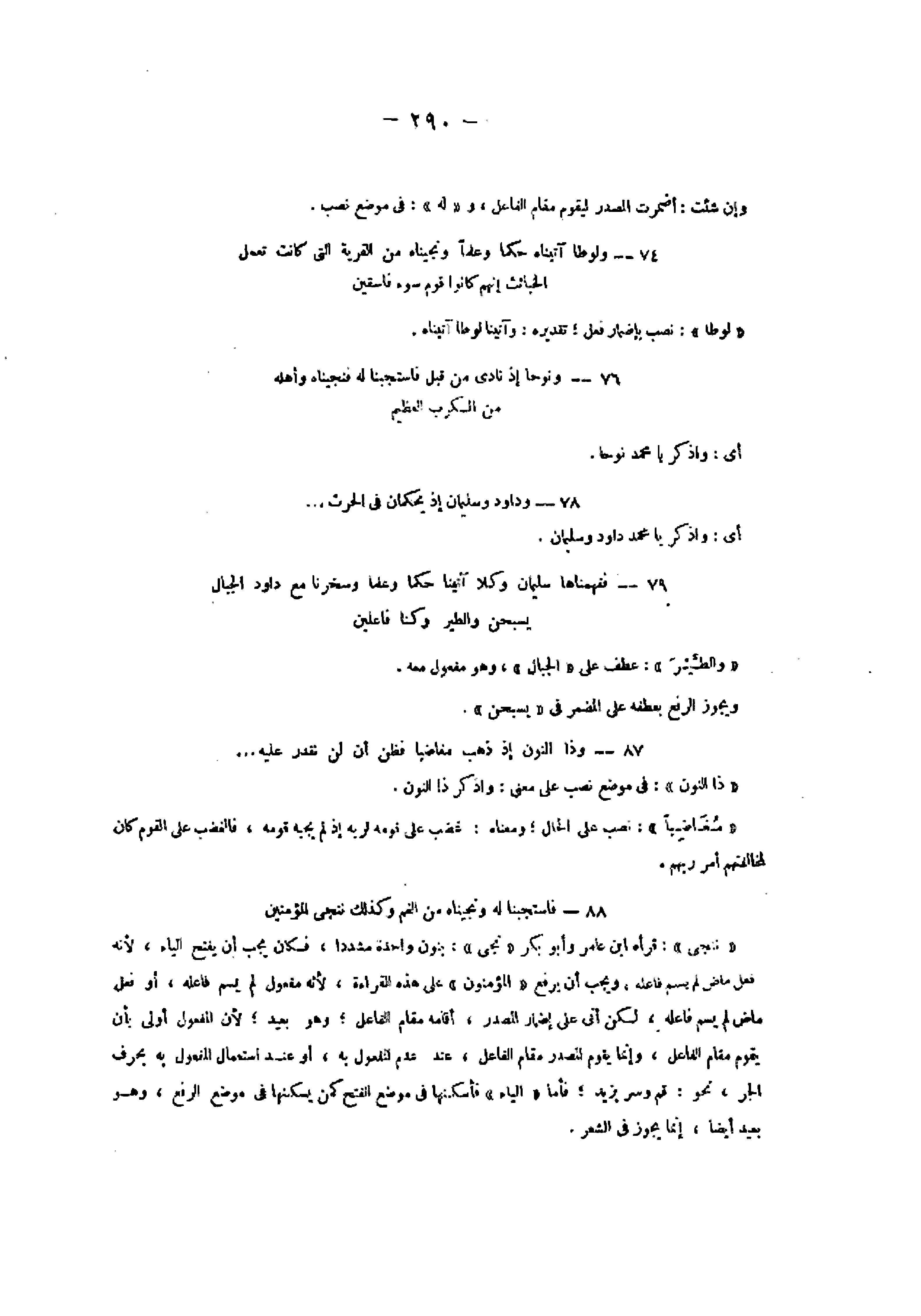 74- وَلُوطاً آتَيْناهُ حُكْماً وَعِلْماً وَنَجَّيْناهُ مِنَ الْقَرْيَةِ الَّتِي كانَتْ تَعْمَلُ الْخَبائِثَ إِنَّهُمْ كانُوا قَوْمَ سَوْءٍ فاسِقِينَ «لوطا» : نصب بإضمار فعل تقديره: وآتينا لوطا آتيناه.