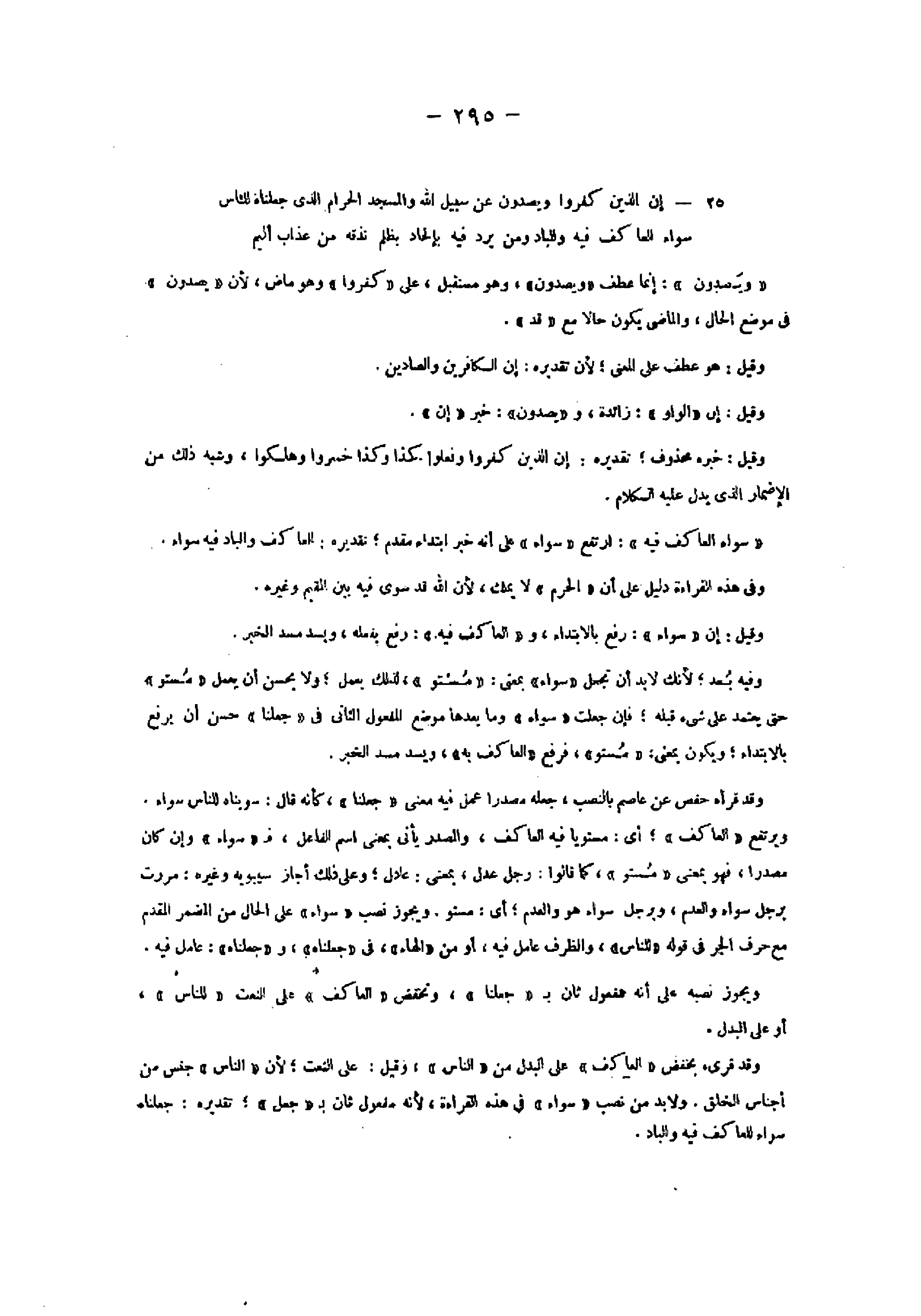 25- إِنَّ الَّذِينَ كَفَرُوا وَيَصُدُّونَ عَنْ سَبِيلِ اللَّهِ وَالْمَسْجِدِ الْحَرامِ الَّذِي جَعَلْناهُ لِلنَّاسِ سَواءً الْعاكِفُ فِيهِ وَالْبادِ وَمَنْ يُرِدْ فِيهِ بِإِلْحادٍ بِظُلْمٍ نُذِقْهُ مِنْ عَذابٍ أَلِيمٍ «ويصدون» : إنما عطف «ويصدون» ، وهو مستقبل، على «كفروا» وهو ماض، لأن «يصدون» فى موضع الحال، والماضي يكون حالا مع «قد» .