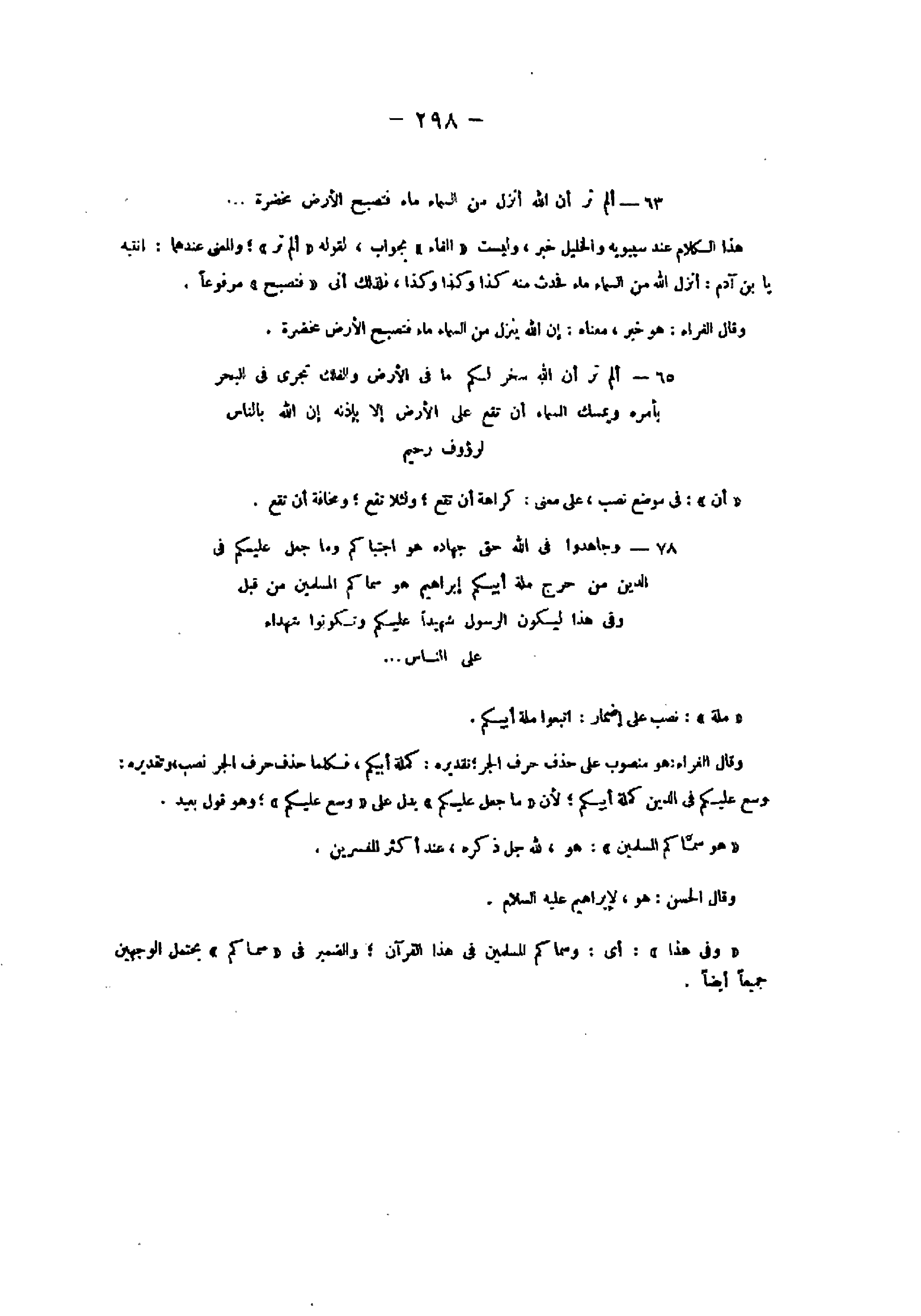 هذا الكلام عند سيبويه والخليل خبر، وليست «الفاء» بجواب، لقوله «ألم تر» والمعنى عندهما: انتبه يا بن آدم: أنزل الله من السماء ماء فحدث منه كذا وكذا وكذا، فلذلك أتى «فتصبح» مرفوعا.