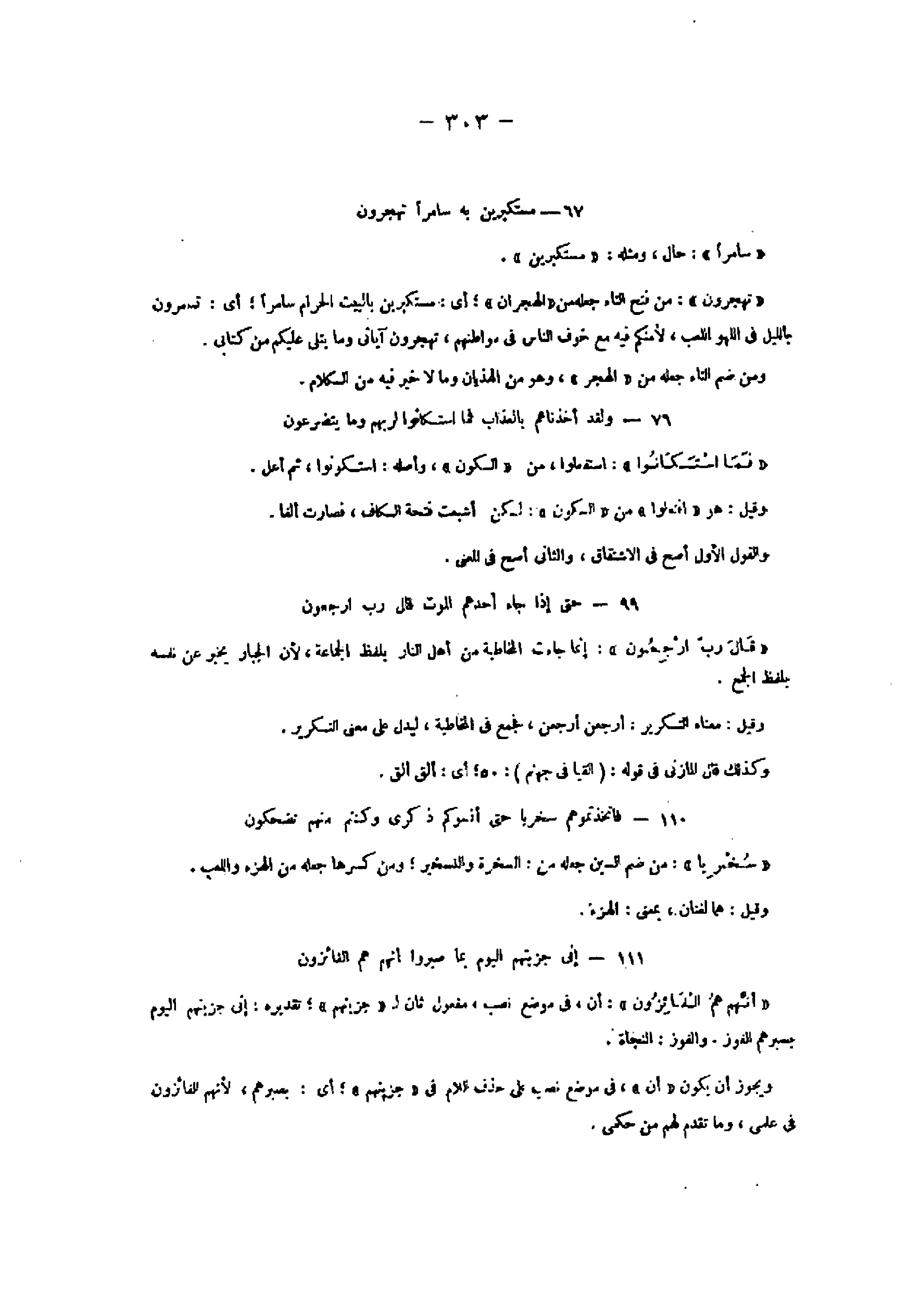 67- مُسْتَكْبِرِينَ بِهِ سامِراً تَهْجُرُونَ «سامرا» : حال، ومثله: «مستكبرين» .