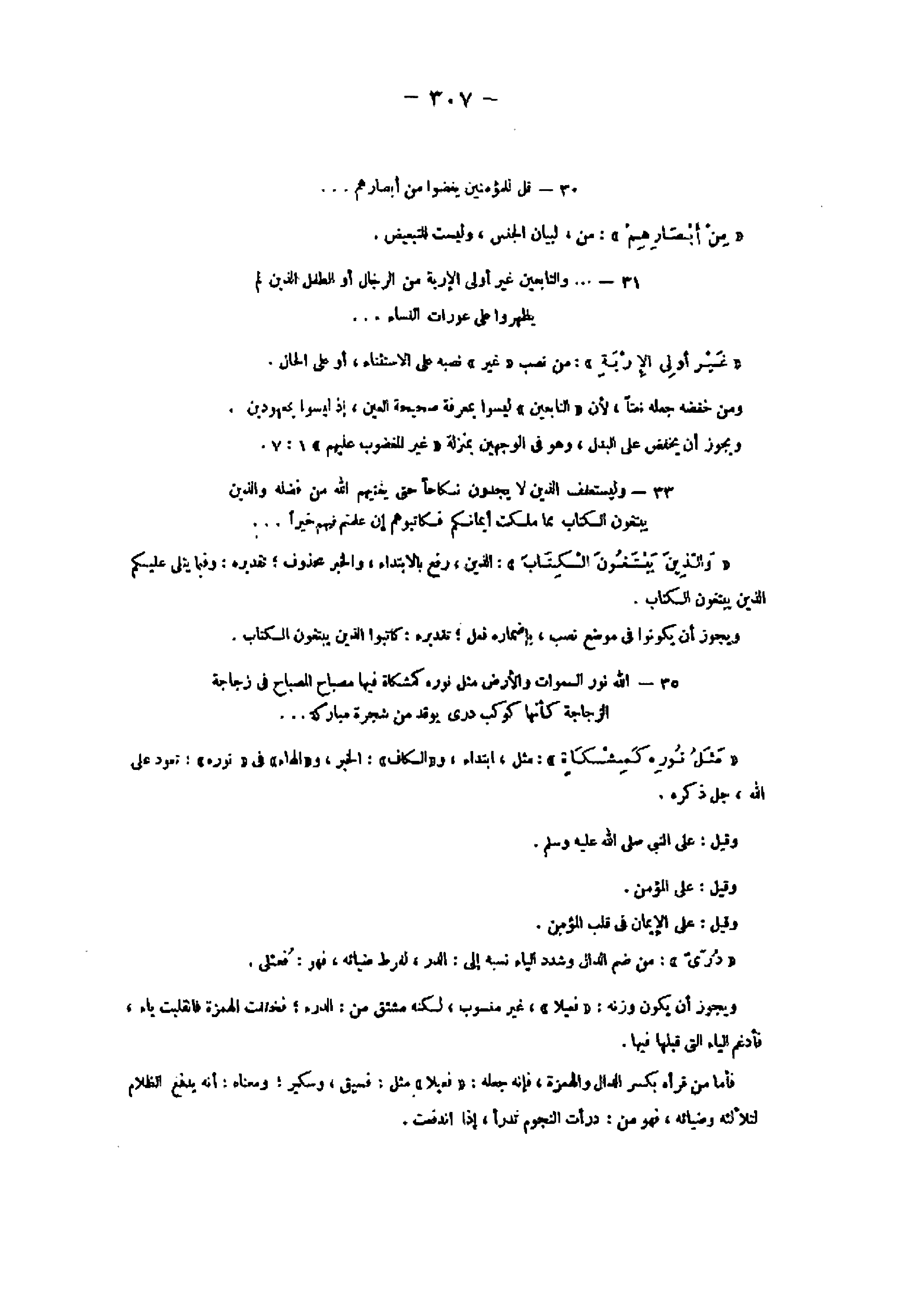 «مثل نوره كمشكاة» : مثل، ابتداء، و «الكاف» : الخبر، و «الهاء» فى «نوره» : تعود على الله، جل ذكره.