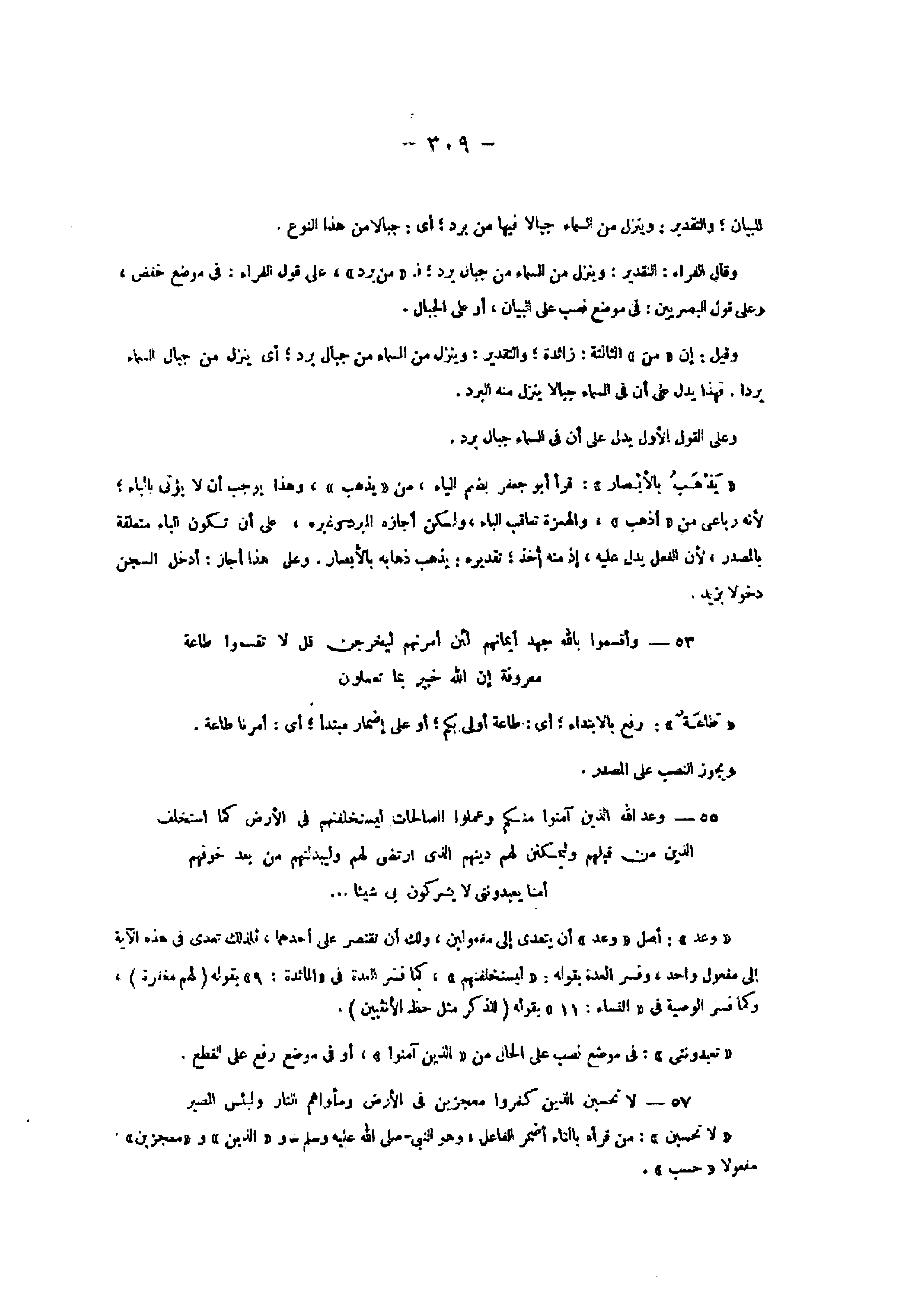 وقال الفراء: التقدير: وينزل من السماء من جبال برد ف «من برد» ، على قول الفراء: فى موضع خفض، وعلى قول البصريين: فى موضع نصب على البيان، أو على الجبال.