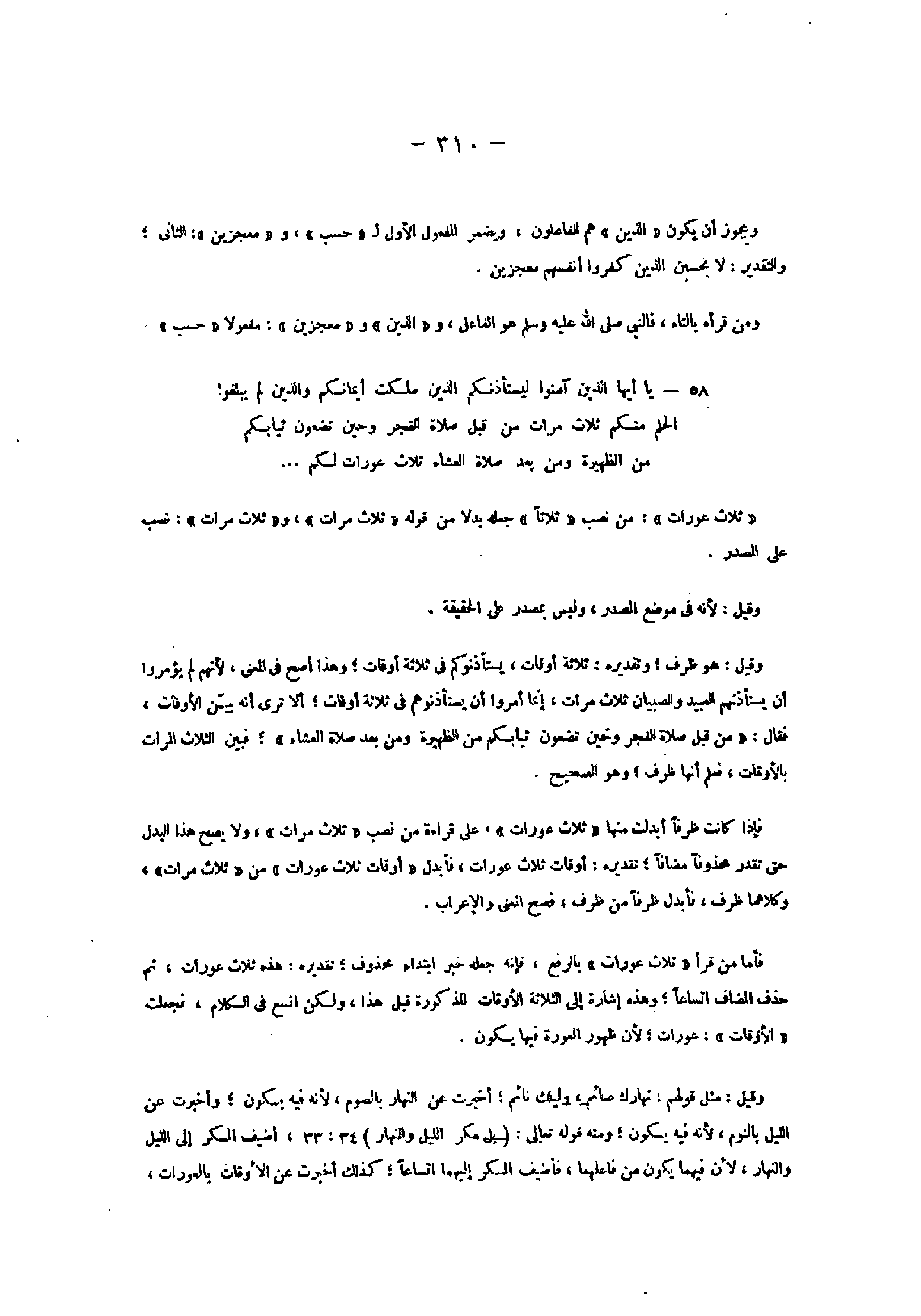 ومن قرأه بالتاء، فالنبى صلى الله عليه وسلم هو الفاعل، و «الذين» و «معجزين» : مفعولا «حسب» 58- يا أَيُّهَا الَّذِينَ آمَنُوا لِيَسْتَأْذِنْكُمُ الَّذِينَ مَلَكَتْ أَيْمانُكُمْ وَالَّذِينَ لَمْ يَبْلُغُوا الْحُلُمَ مِنْكُمْ ثَلاثَ مَرَّاتٍ مِنْ قَبْلِ صَلاةِ الْفَجْرِ وَحِينَ تَضَعُونَ ثِيابَكُمْ مِنَ الظَّهِيرَةِ وَمِنْ بَعْدِ صَلاةِ الْعِشاءِ ثَلاثُ عَوْراتٍ لَكُمْ ...