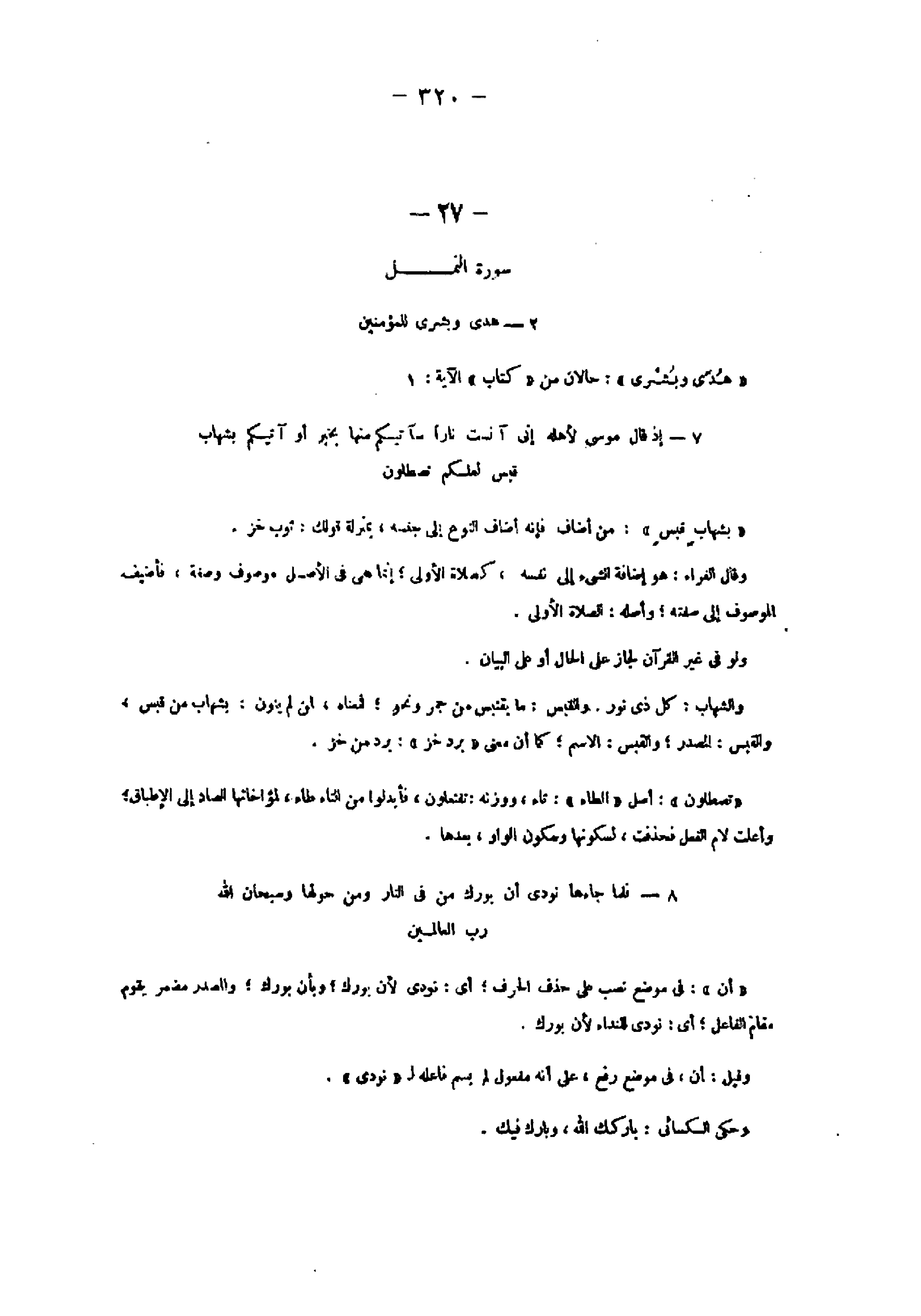 2- هُدىً وَبُشْرى لِلْمُؤْمِنِينَ «هدى وبشرى» : حالان من «كتاب» الآية: 1 7- إِذْ قالَ مُوسى لِأَهْلِهِ إِنِّي آنَسْتُ ناراً سَآتِيكُمْ مِنْها بِخَبَرٍ أَوْ آتِيكُمْ بِشِهابٍ قَبَسٍ لَعَلَّكُمْ تَصْطَلُونَ «بشهاب قبس» : من أضاف فإنه أضاف النوع إلى جنسه، بمنزلة قولك: ثوب خز.