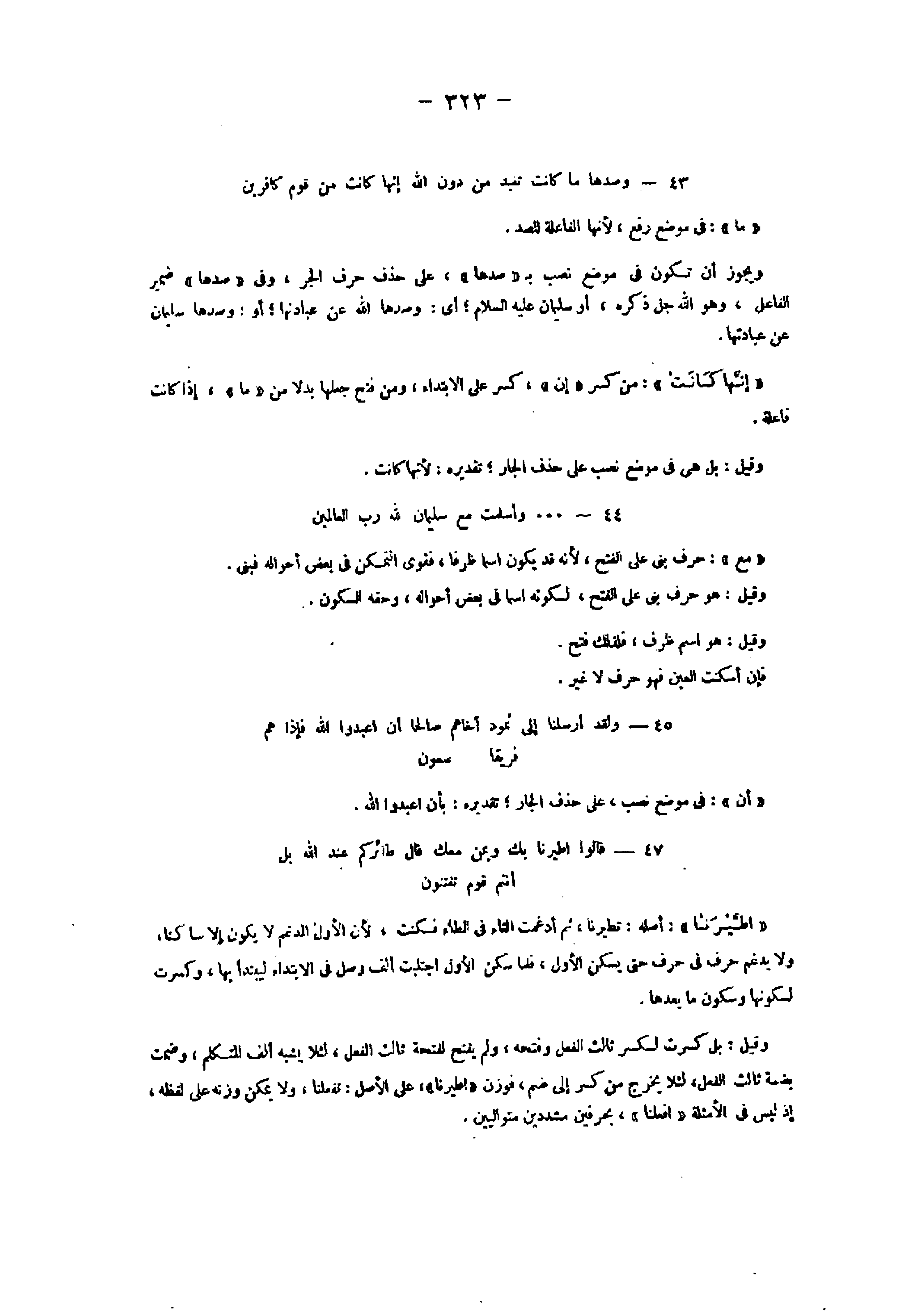 43- وَصَدَّها ما كانَتْ تَعْبُدُ مِنْ دُونِ اللَّهِ إِنَّها كانَتْ مِنْ قَوْمٍ كافِرِينَ «ما» : فى موضع رفع، لأنها الفاعلة للصد.