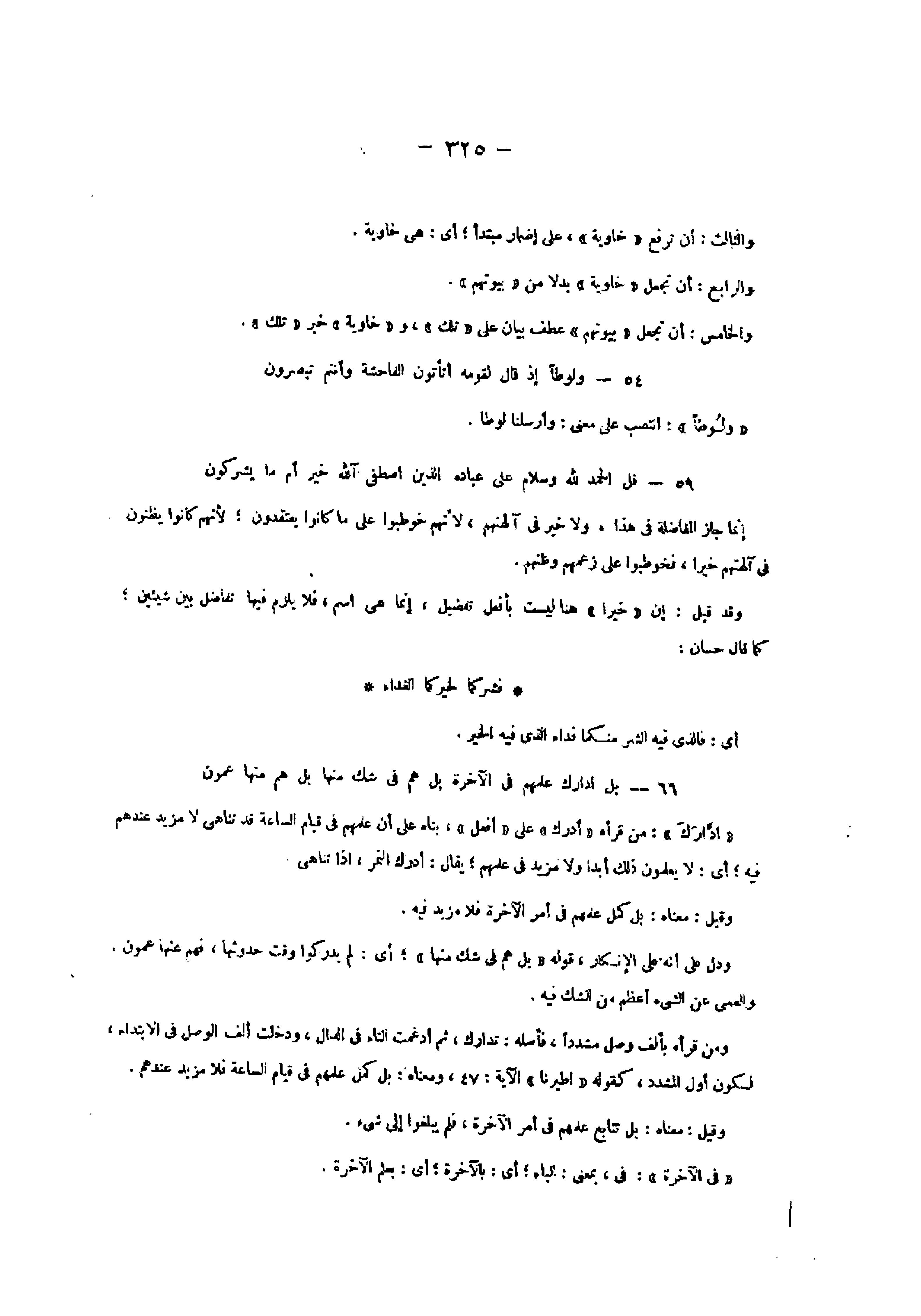 59- قُلِ الْحَمْدُ لِلَّهِ وَسَلامٌ عَلى عِبادِهِ الَّذِينَ اصْطَفى آللَّهُ خَيْرٌ أَمَّا يُشْرِكُونَ إنما جاز المفاضلة فى هذا، ولا خير فى آلهتهم، لأنهم خرطبوا على ما كانوا يعتقدون لأنهم كانوا يظنون فى آلهتهم خيرا، فخوطبوا على زعمهم وظنهم.