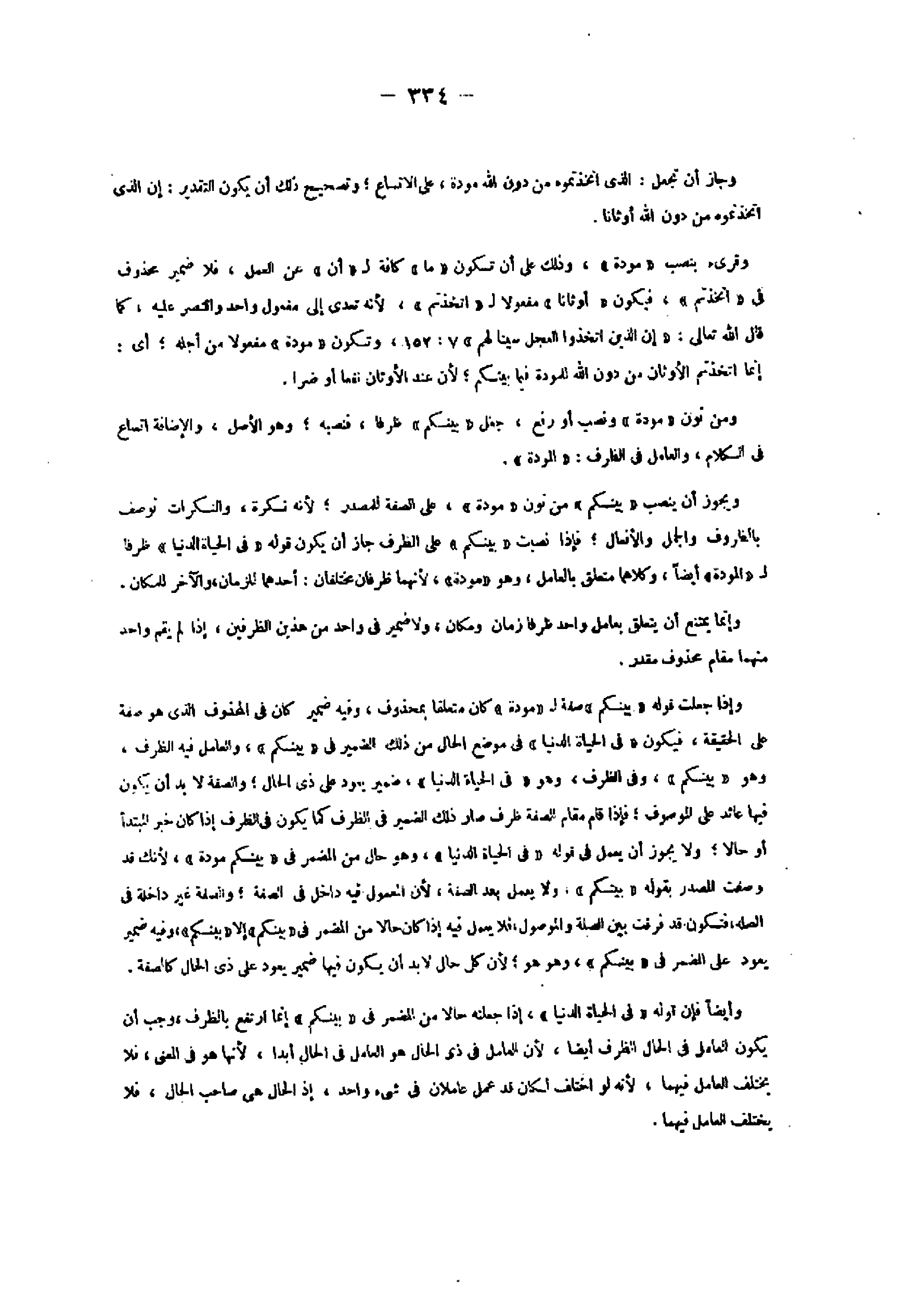 وإذا جعلت قوله «بينكم» صفة ل «مودة» كان متعلقا بمحذوف، وفيه ضمير كان فى المحذوف الذي هو صفة على الحقيقة، فيكون «فى الحياة الدنيا» فى موضع الحال من ذلك الضمير فى «بينكم» ، والعامل فيه الظرف، وهو «بينكم» ، وفى الظرف، وهو «فى الحياة الدنيا» ، ضمير يعود على ذى الحال والصفة لا بد أن يكون فيها عائد على الموصوف فإذا قام مقام الصفة ظرف صار ذلك الضمير فى الظرف كما يكون فى الظرف إذا كان خبر المبتدأ أو حالا ولا يجوز أن يعمل فى قوله «فى الحياة الدنيا» ، وهو حال من المضمر فى «بينكم مودة» لأنك قد وصفت المصدر بقوله «بينكم» . ولا يعمل بعد الصفة، لأن المعمول فيه داخل فى الصفة والصفة غير داخلة فى الصلة، فتكون قد فرقت بين الصلة والموصول، فلا يعمل فيه إذا كان حالا من المضمر فى «بينكم» إلا «بينكم» ، وفيه ضمير يعود على المضمر فى «بينكم» ، وهو هو لأن كل حال لا بد أن يكون فيها ضمير يعود على ذى الحال كالصفة.