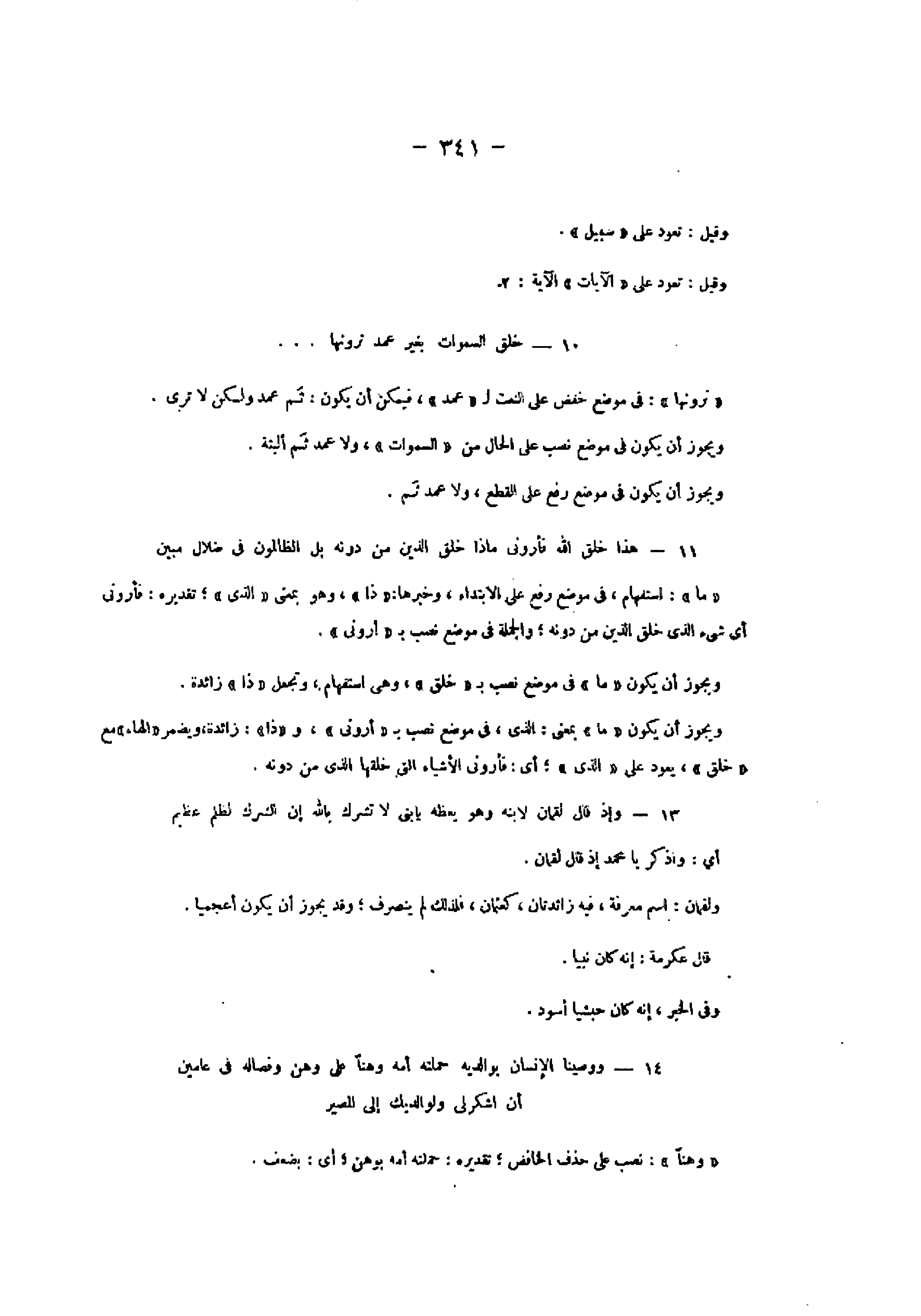 ويجوز أن يكون «ما» بمعنى: الذي، فى موضع نصب ب «أرونى» ، و «ذا» : زائدة، ويضمر «الهاء» مع «خلق» ، ويعود على «الذي» أي: فأرونى الأشياء التي خلقها الذي من دونه.