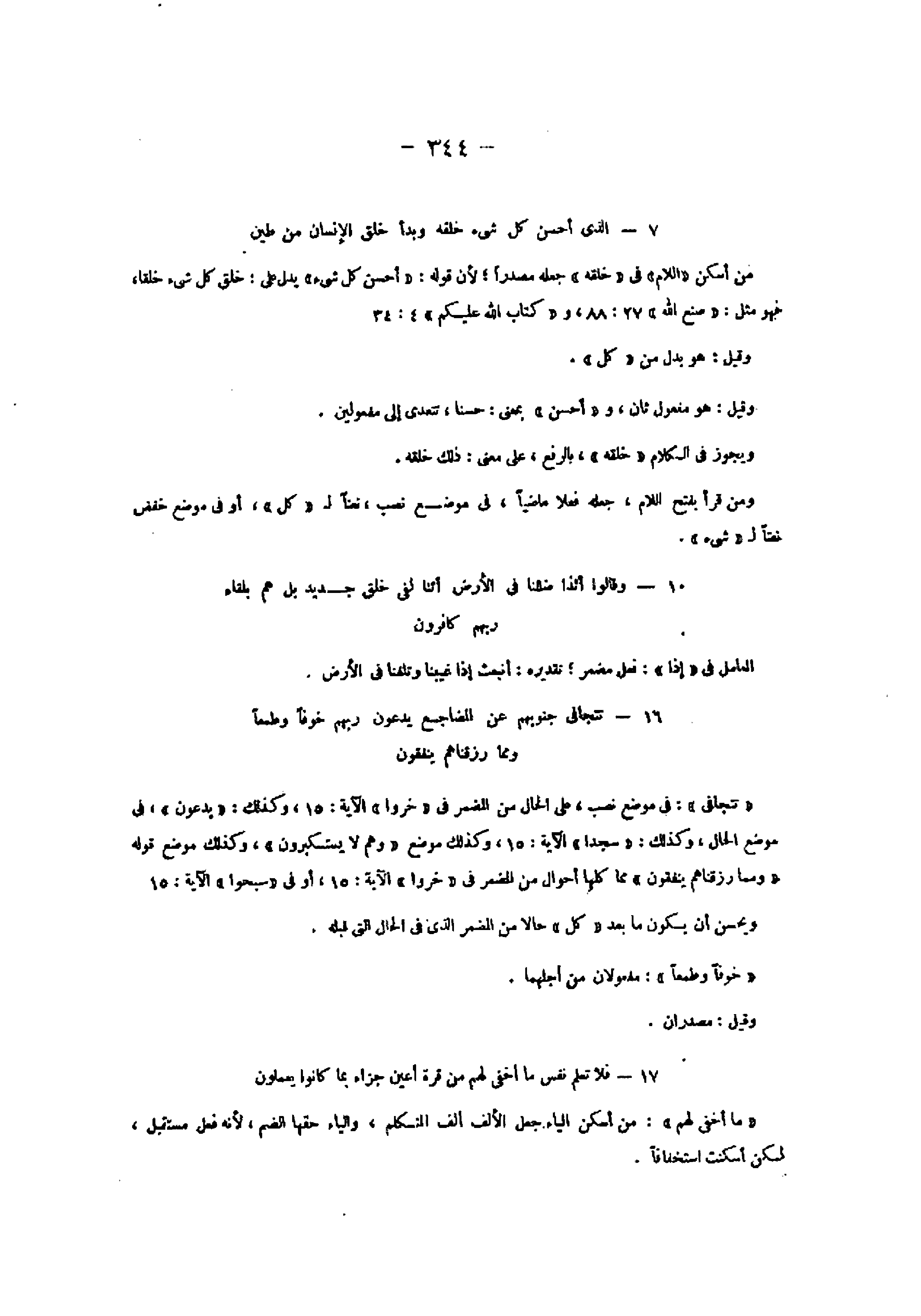 16- تَتَجافى جُنُوبُهُمْ عَنِ الْمَضاجِعِ يَدْعُونَ رَبَّهُمْ خَوْفاً وَطَمَعاً وَمِمَّا رَزَقْناهُمْ يُنْفِقُونَ «تتجافى» : فى موضع نصب، على الحال من المضمر فى «خروا» الآية: 15، وكذلك: «يدعون» ، فى موضع الحال، وكذلك: «سجدا» الآية: 15، وكذلك موضع «وهم لا يستكبرون» ، وكذلك موضع قوله «ومما رزقناهم ينفقون» مما كلها أحوال من المضمر فى «خروا» الآية: 15، أو فى «سبحوا» الآية: 15 ويحسن أن يكون ما بعد «كل» حالا من المضمر الذي فى الحال التي قبله.