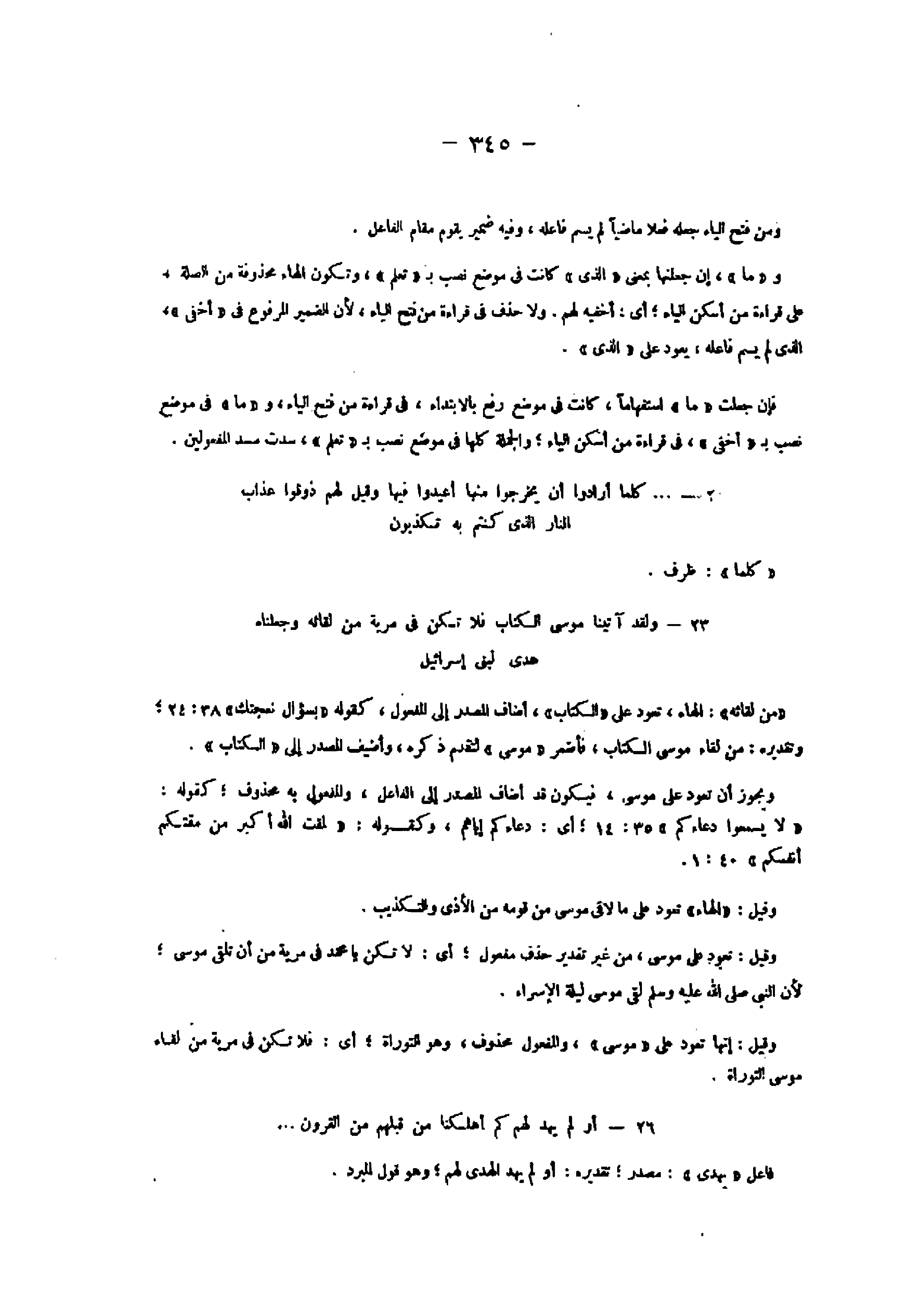 23- وَلَقَدْ آتَيْنا مُوسَى الْكِتابَ فَلا تَكُنْ فِي مِرْيَةٍ مِنْ لِقائِهِ وَجَعَلْناهُ هُدىً لِبَنِي إِسْرائِيلَ «من لقائه» : الهاء، تعود على «الكتاب» ، أضاف المصدر إلى المفعول، كقوله «بِسُؤالِ نَعْجَتِكَ» 38: 24 وتقديره: من لقاء موسى الكتاب، فأضمر «موسى» لتقدم ذكره، وأضيف المصدر إلى «الكتاب» .
