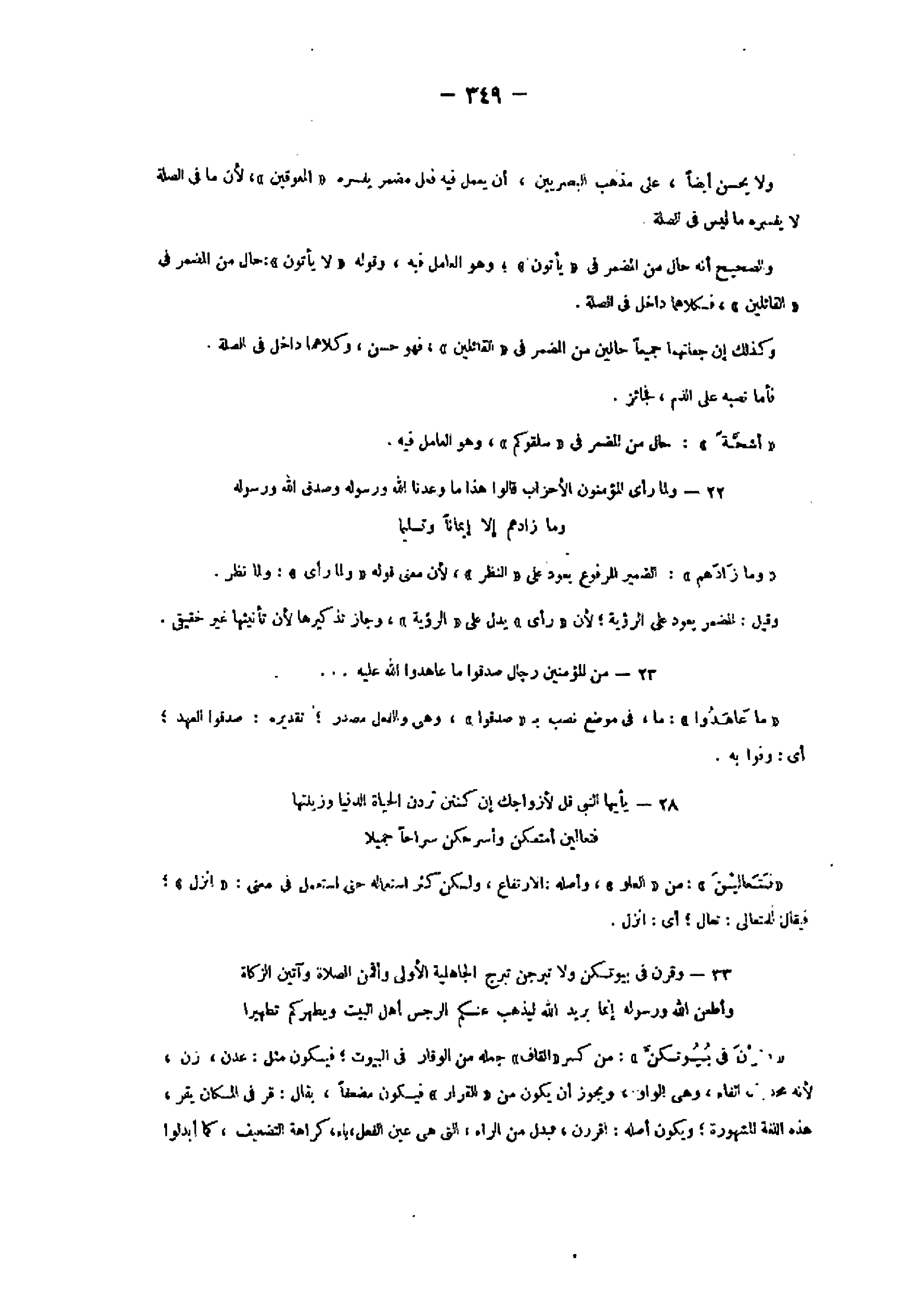 33- وَقَرْنَ فِي بُيُوتِكُنَّ وَلا تَبَرَّجْنَ تَبَرُّجَ الْجاهِلِيَّةِ الْأُولى وَأَقِمْنَ الصَّلاةَ وَآتِينَ الزَّكاةَ وَأَطِعْنَ اللَّهَ وَرَسُولَهُ إِنَّما يُرِيدُ اللَّهُ لِيُذْهِبَ عَنْكُمُ الرِّجْسَ أَهْلَ الْبَيْتِ وَيُطَهِّرَكُمْ تَطْهِيراً «وقرن فى بيوتكنّ» : من كسر «القاف» جعله من الوقار فى البيوت فيكون مثل: عدن، زن، لأنه محذوف الفاء، وهى الواو، ويجوز أن يكون من «القرار» فيكون مضعفا، يقال: قر فى المكان يقر، هذه اللغة المشهورة ويكون أصله: اقررن، تبدل من الراء، التي هى عين الفعل، ياء، كراهة التضعيف، كما أبدلوا