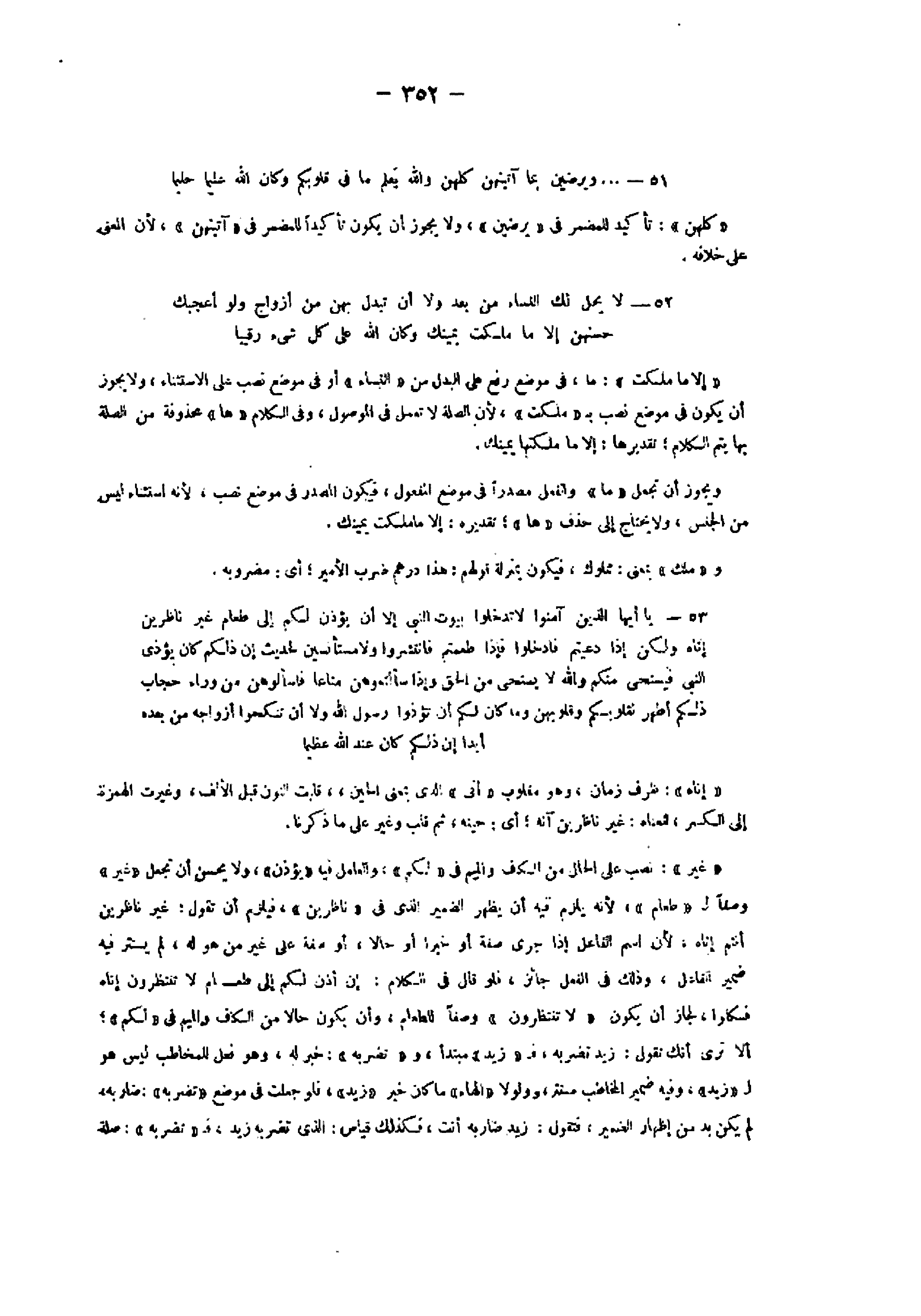 52- لا يَحِلُّ لَكَ النِّساءُ مِنْ بَعْدُ وَلا أَنْ تَبَدَّلَ بِهِنَّ مِنْ أَزْواجٍ وَلَوْ أَعْجَبَكَ حُسْنُهُنَّ إِلَّا ما مَلَكَتْ يَمِينُكَ وَكانَ اللَّهُ عَلى كُلِّ شَيْءٍ رَقِيباً «إلا ما ملكت» : ما، فى موضع رفع على البدل من «النساء» أو فى موضع نصب على الاستثناء، ولا يجوز أن يكون فى موضع نصب ب «ملكت» ، لأن الصلة لا تعمل فى الموصول، وفى الكلام «ها» محذوفة، من الصلة بها يتم الكلام تقديرها: إلا ما ملكتها يمينك.